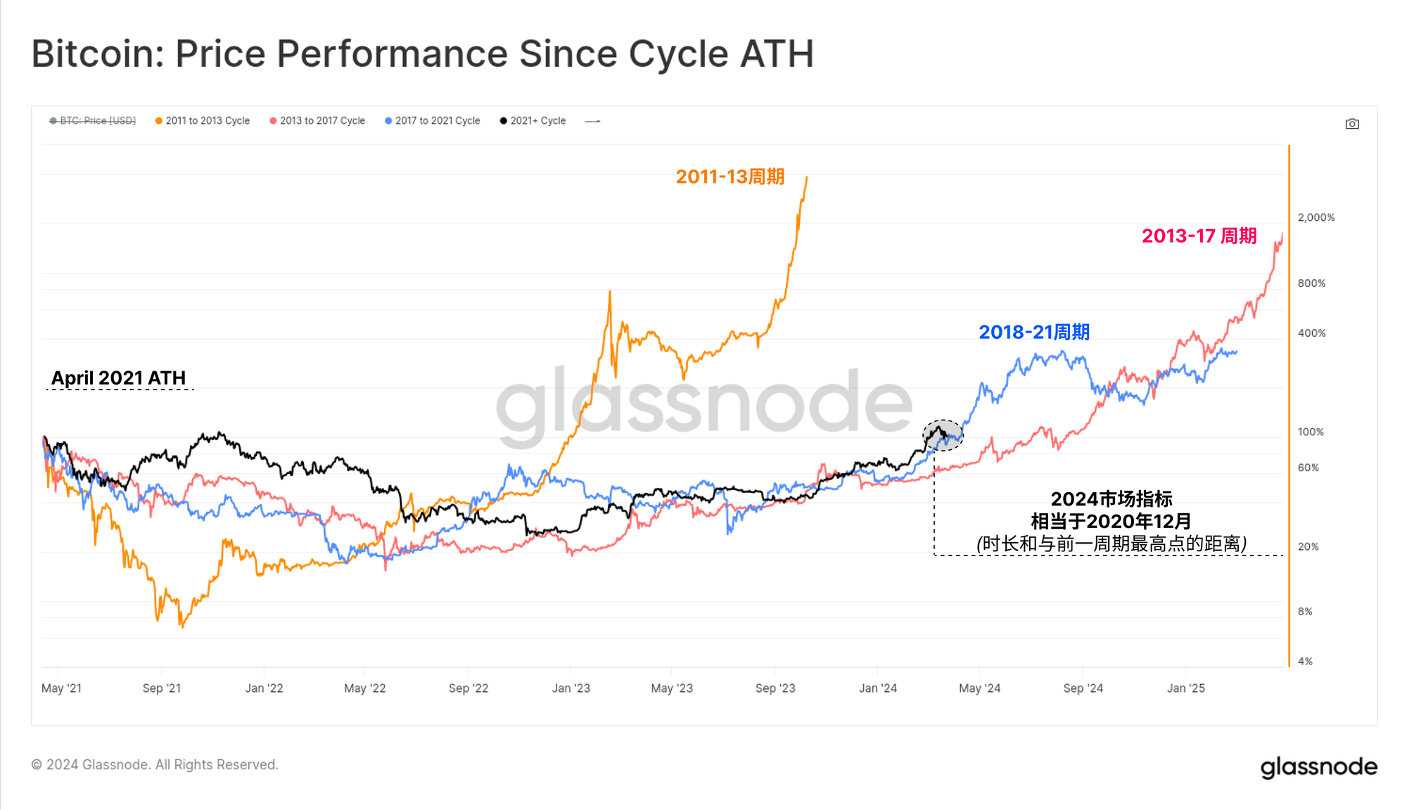 - 比特币价格从最新高点7.3万美元的历史最高点回落了15.4%,最低达到了6.1万美元。这个价格行为与之前的2018-21年周期非常吻合。