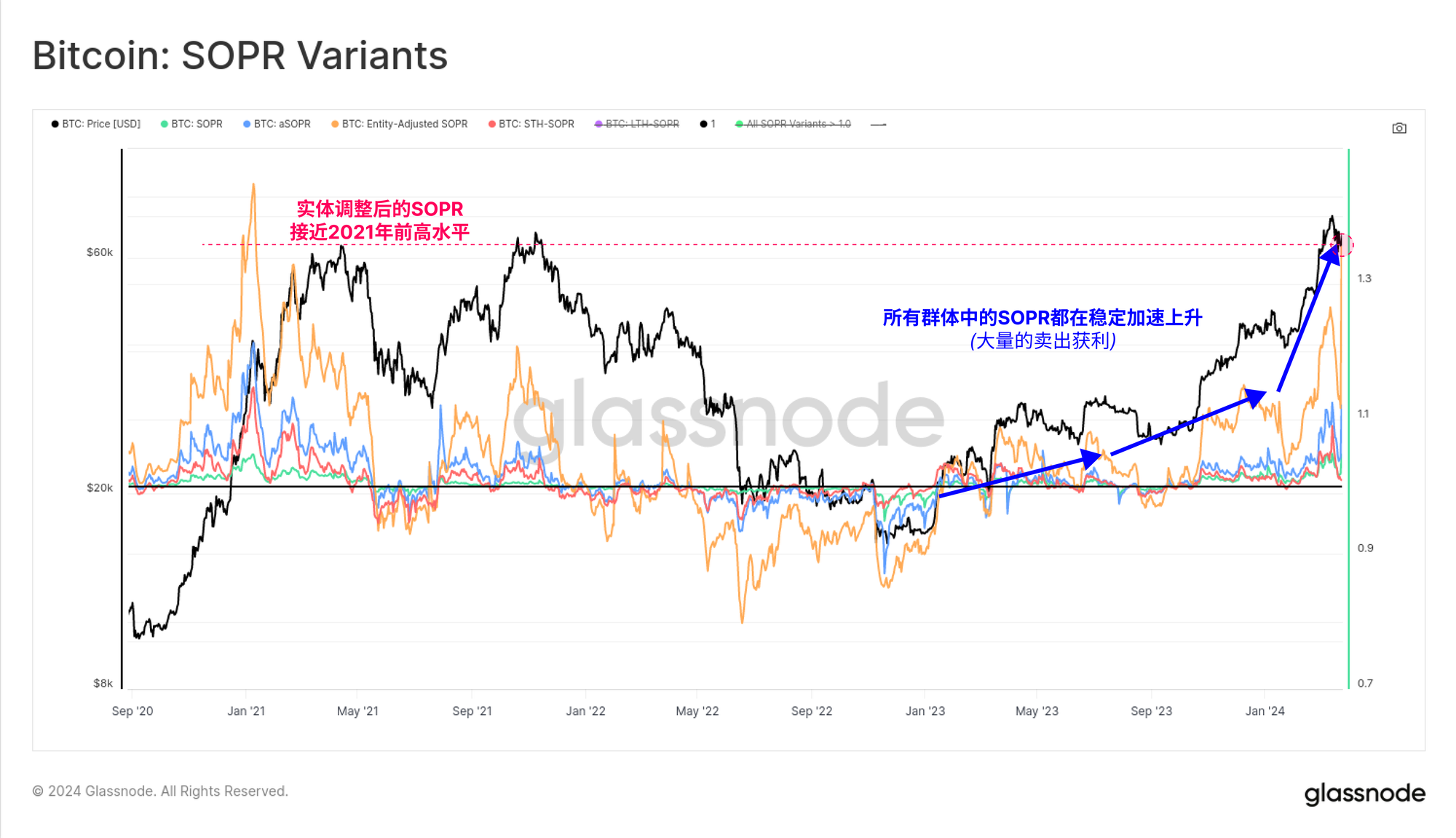 现在有200万枚比特币的成本基础超过了6.12万美元,这些比特币最近已经易手,前任持有者卖出了它们来锁定利润。下面的图表展示了SOPR指标的几种变体,这些变体描述了这种实现利润的行为。