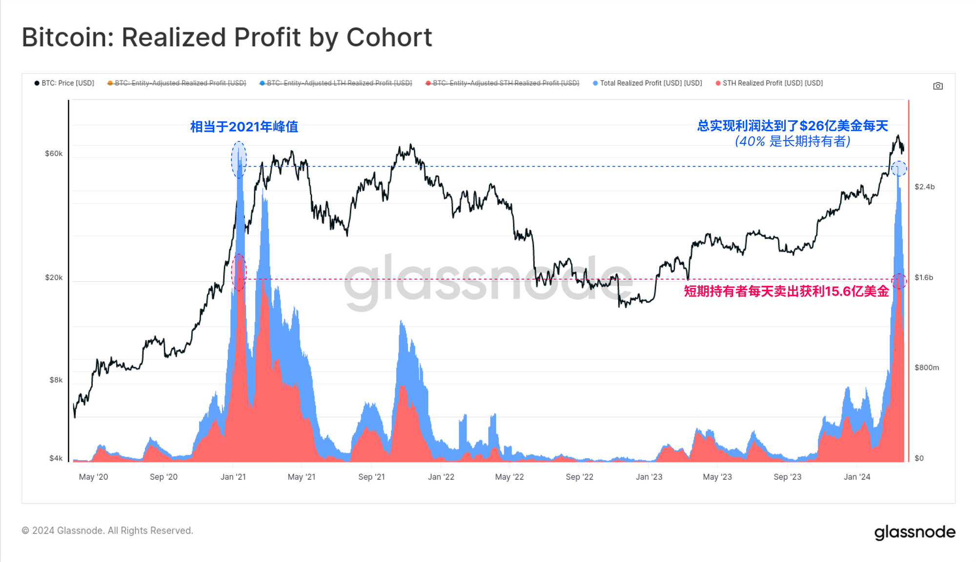 随着比特币在新的历史最高点73000美元处遇到阻力,长期持有者群体已经加大了他们的整体卖出压力。市场目前每天实现超过26亿美元的利润,因为投资者开始撤离赌桌。