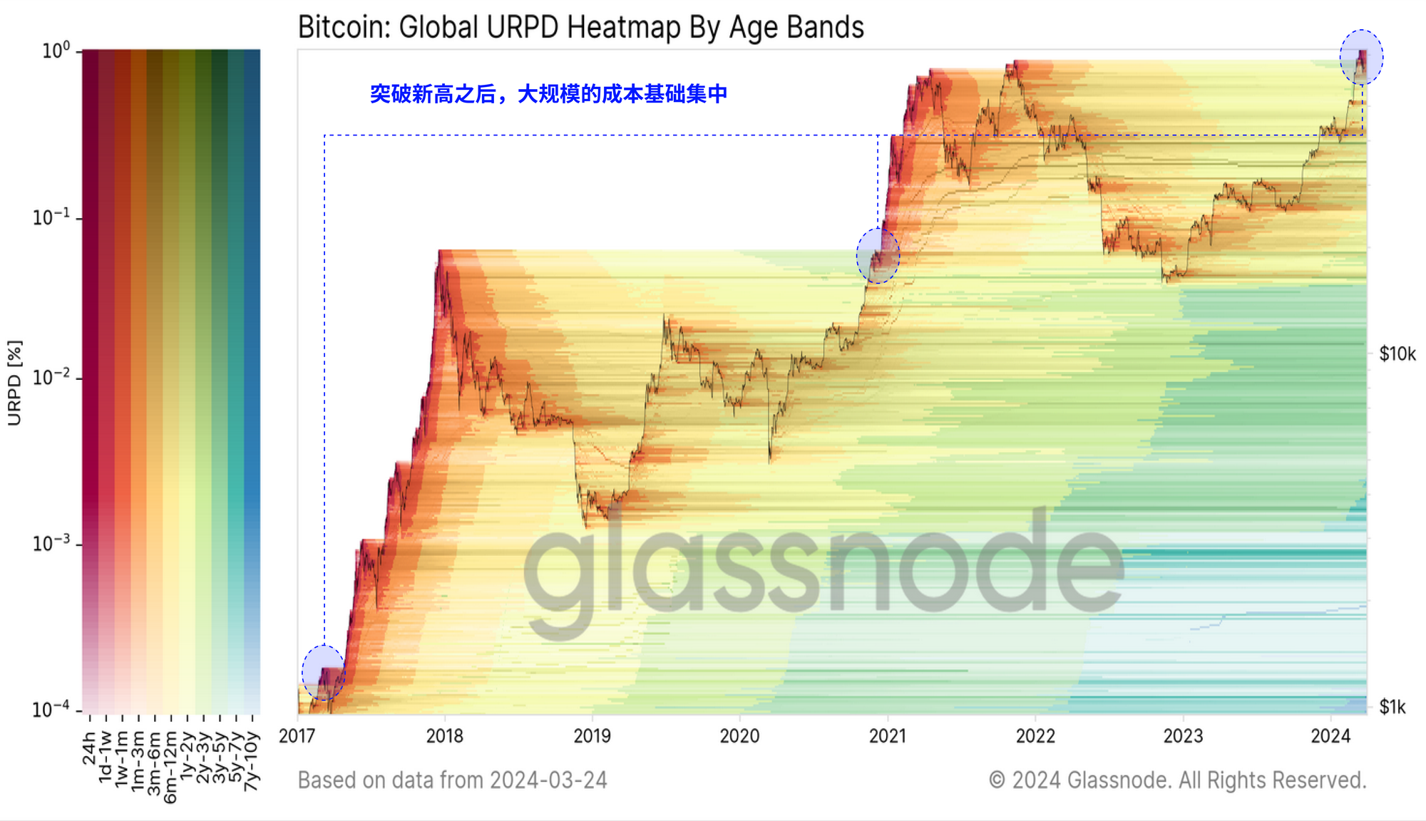 最后,我们可以参考一张相当吸引人的图表,该图表随时间和币龄展示了供应群体。我们用蓝色高亮显示了之前价格突破历史新高,催化了向“红热供应”的明显过渡。