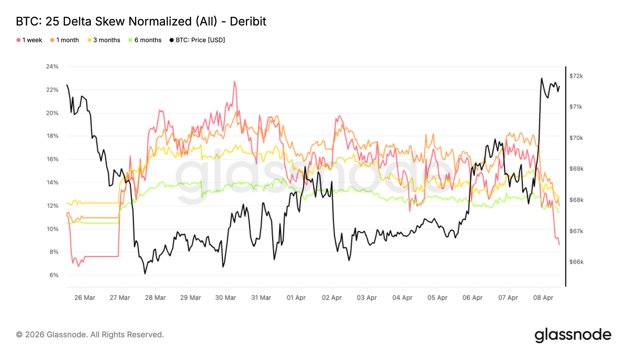 当前结构仍偏向看跌期权,这意味着下行保护仍以溢价交易,相对于上行敞口更为昂贵。这表明市场参与者在降低整体波动率敞口的同时,并不愿意放弃对不利价格波动的保护。