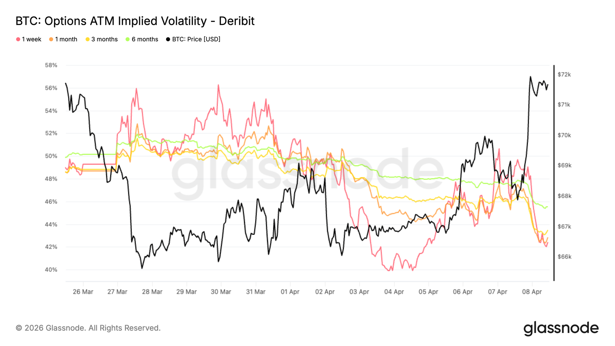 伊朗冲突停火的宣布进一步压低了波动率,加速了已在进行中的压缩过程。这一变化表明市场正在计入一个更为平静的短期环境,尽管出现了局势缓和的迹象,但整体信心仍然有限,愿意为保护性或凸性敞口支付溢价的参与者减少。