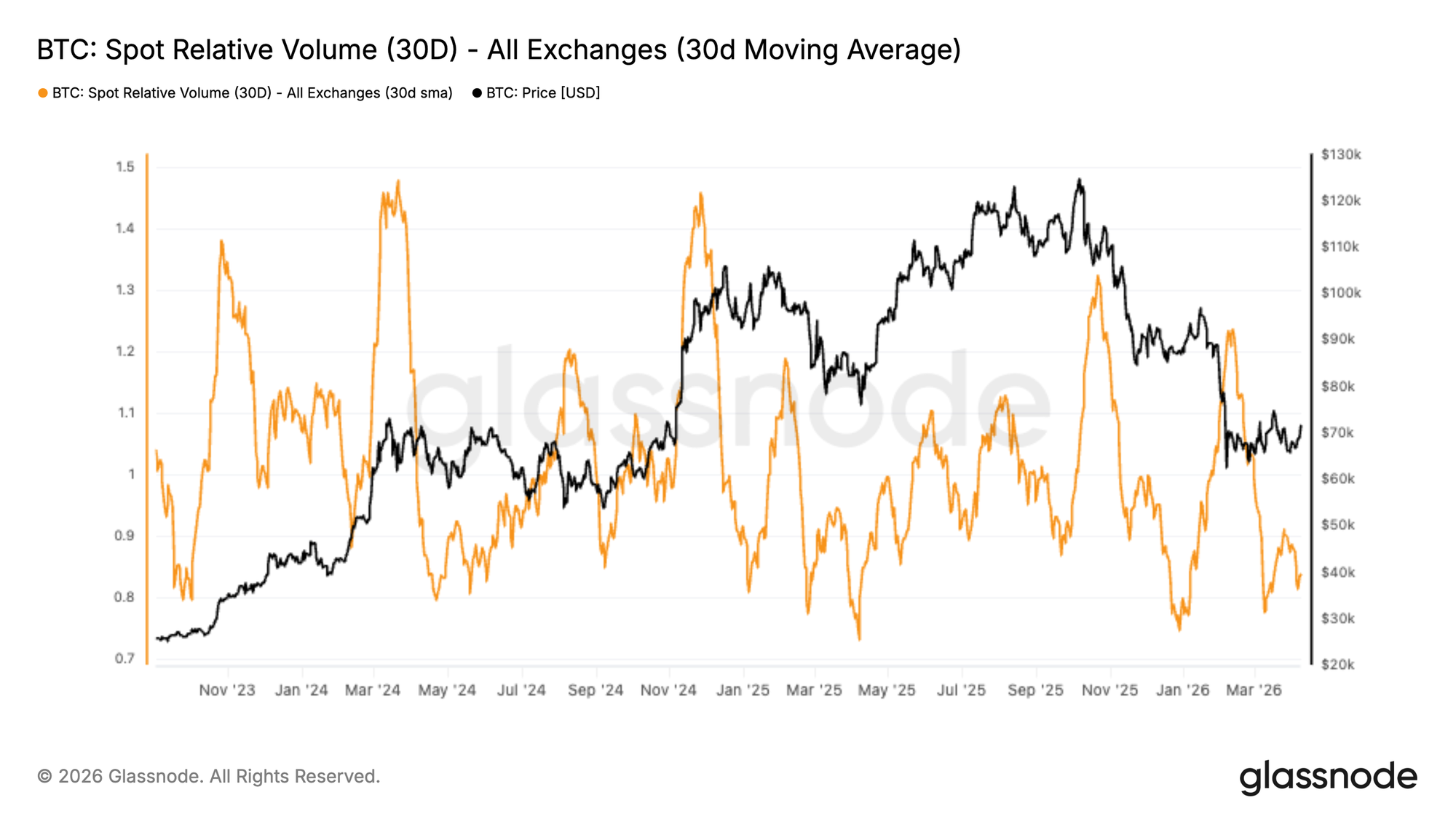 现货交易活动仍然低迷,币安30天相对交易量低于1.0基准水平,并徘徊在其区间的低位附近。最新数据显示仅出现轻微回升,但不足以表明参与度出现实质性回归。