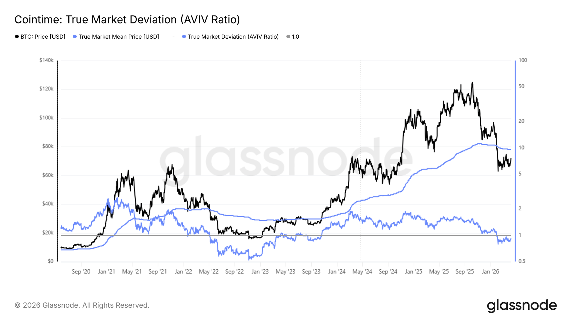 在真实市场均值(78,000美元)作为潜在中期反弹上限的背景下,AVIV比率为理解当前市场相对于历史熊市周期所处位置提供了一个精确的量化视角。该指标定义为现货价格与真实市场均值之比,用于衡量市场价格相对于活跃投资者成本基准的偏离程度,是跨周期阶段的重要估值指标。
