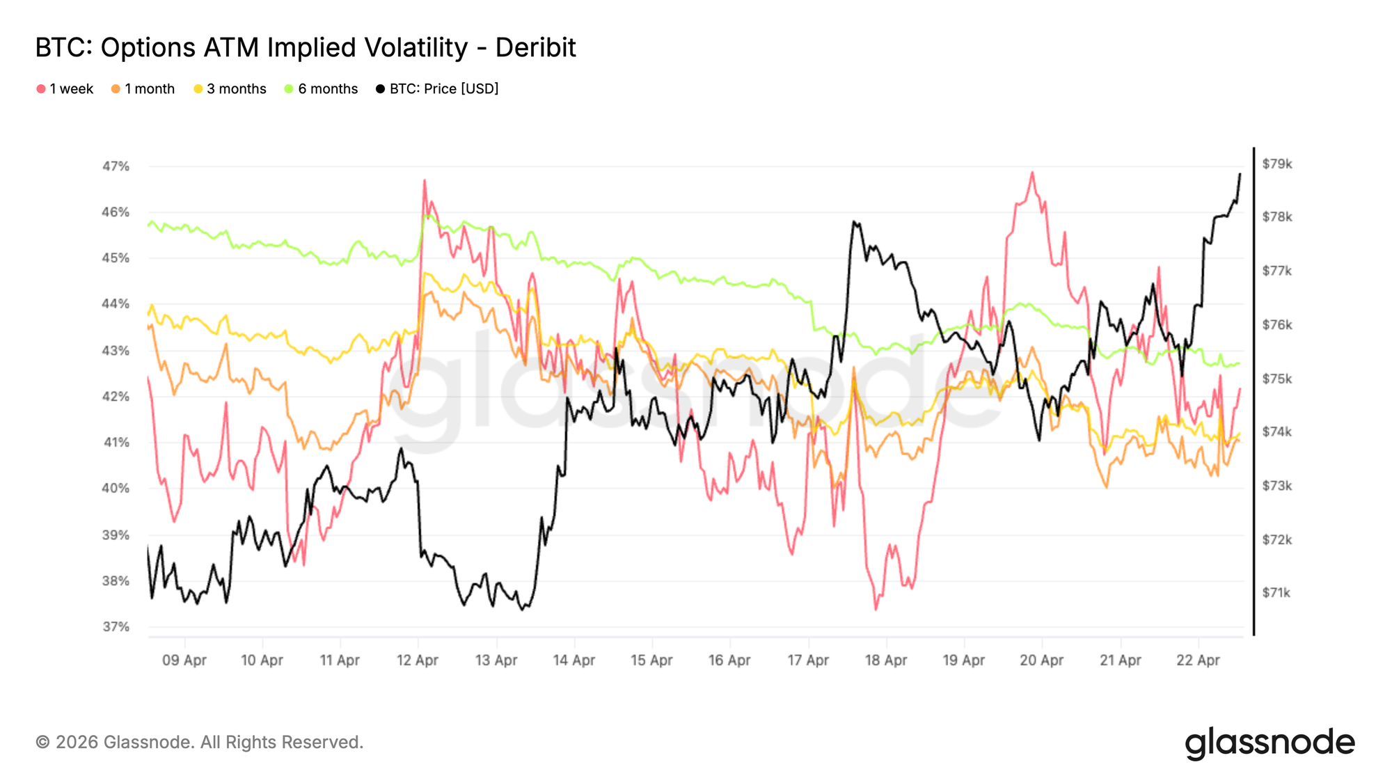 比特币30天已实现波动率目前为40.7%,低于4月初的49%,价格动作仍保持在一个区间内,且跟进力度有限。这很重要,因为已实现波动率是期权定价的基准。当已实现波动率保持较低时,隐含波动率很难维持任何上涨,因为没有基础市场压力来支撑更高的溢价。