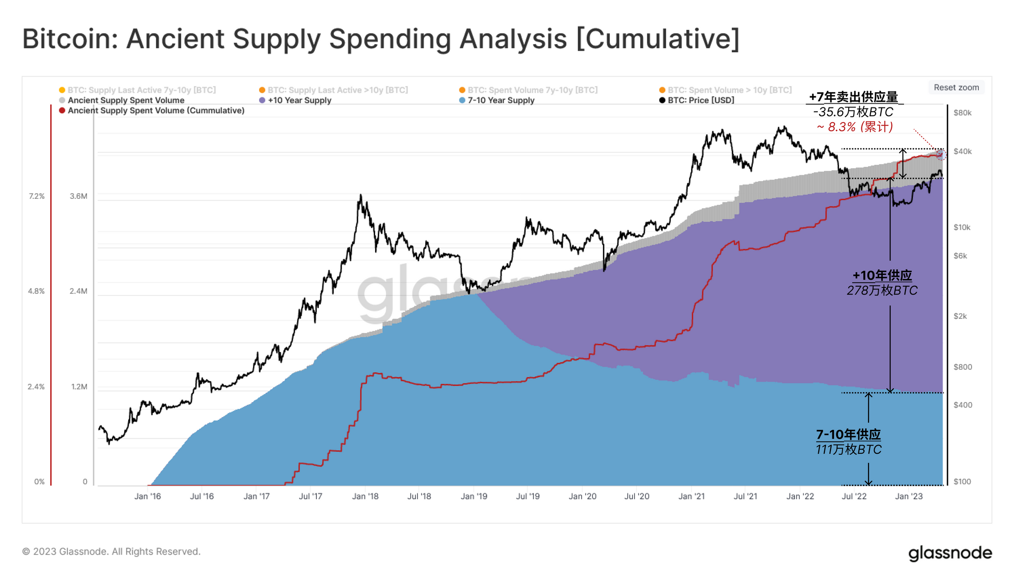 从古老供应量的角度来看,我们发现,自比特币诞生以来,只有425万枚比特币达到了古老供应量(7年以上)的状态。值得注意的是,这些古币中只有35.6万枚曾被卖出过,相当于历史总量的8.3%。剩下的390万枚(占流通供应量的20%)仍然处于休眠状态,通常被认为已经丢失。