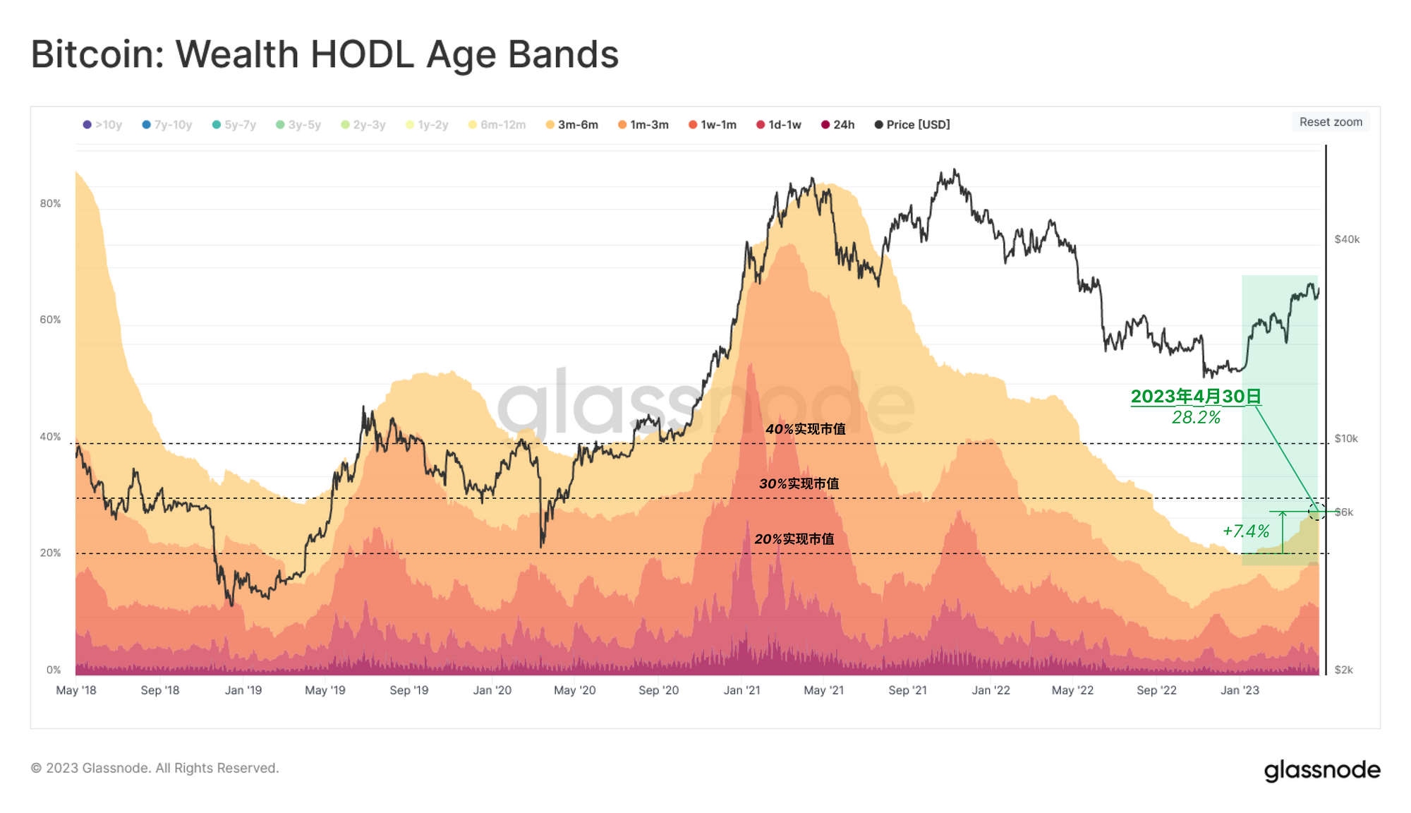 总投资财富的28.2%掌握在最近的买家手中,这个数值仍然非常低,还没有超过以前的牛市中出现的+40%的门槛水平。这表明,新的需求流入仍然相对疲软,但供应仍然主要由长期的、信念较高的持有人持有。