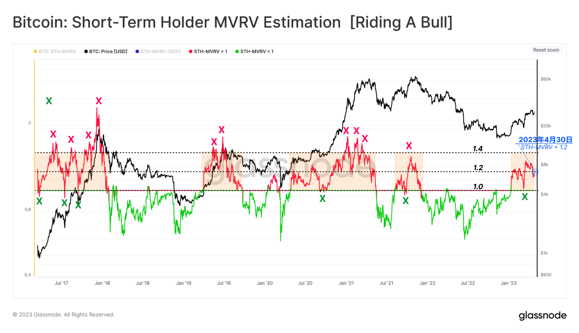 2. STH-供应利润>80%(盈亏比>4):投资者们通常重新审视在宏观上升趋势中的修正过程,这个指标可作为近期卖家耗尽的信号点。