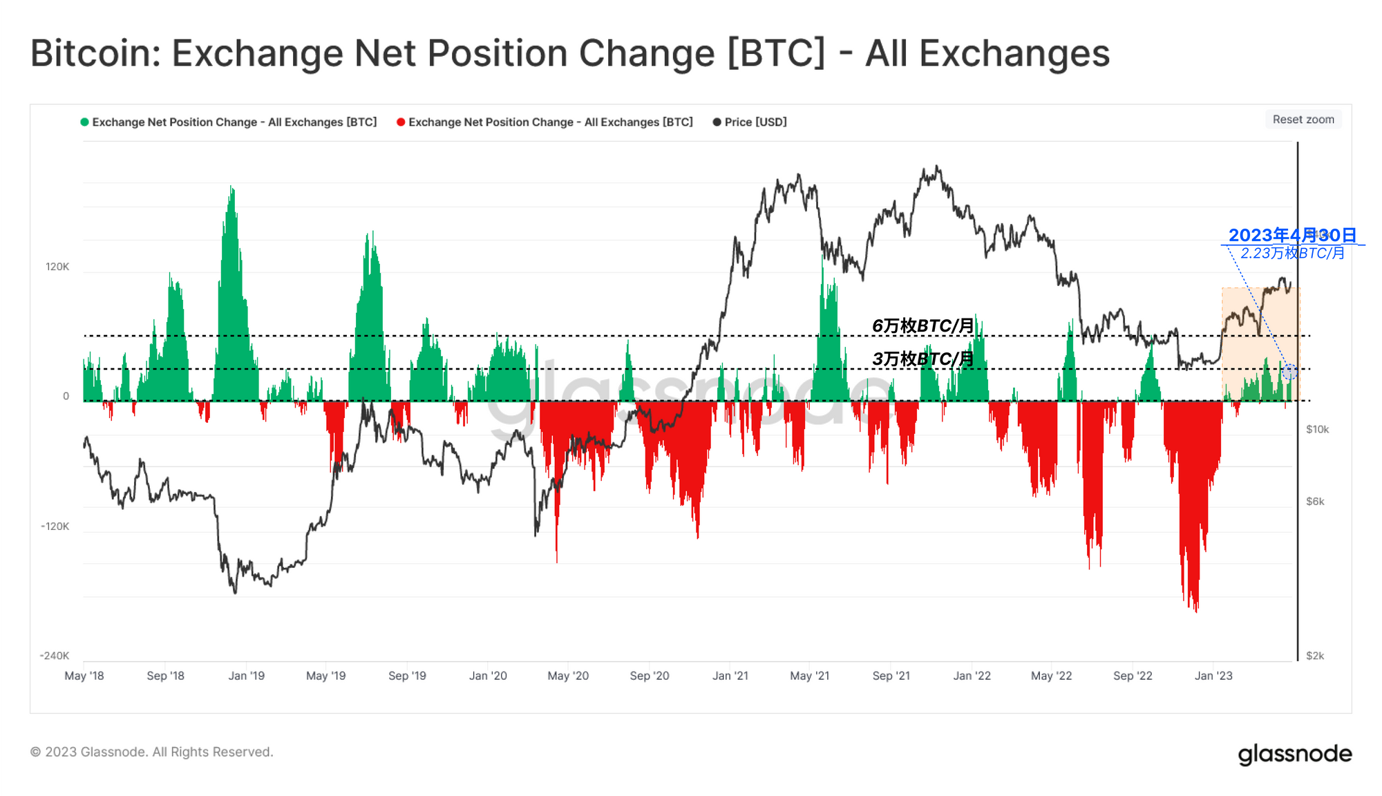 最近的涨势也不例外,最近有非同小可的资金流入交易所,最近几周内,市场将交易所的净头寸变化 推至+3万枚比特币/月以上。这个指标已经略微下降到2.23万枚比特币/月,这意味着市场上的卖压较小,但持续存在。