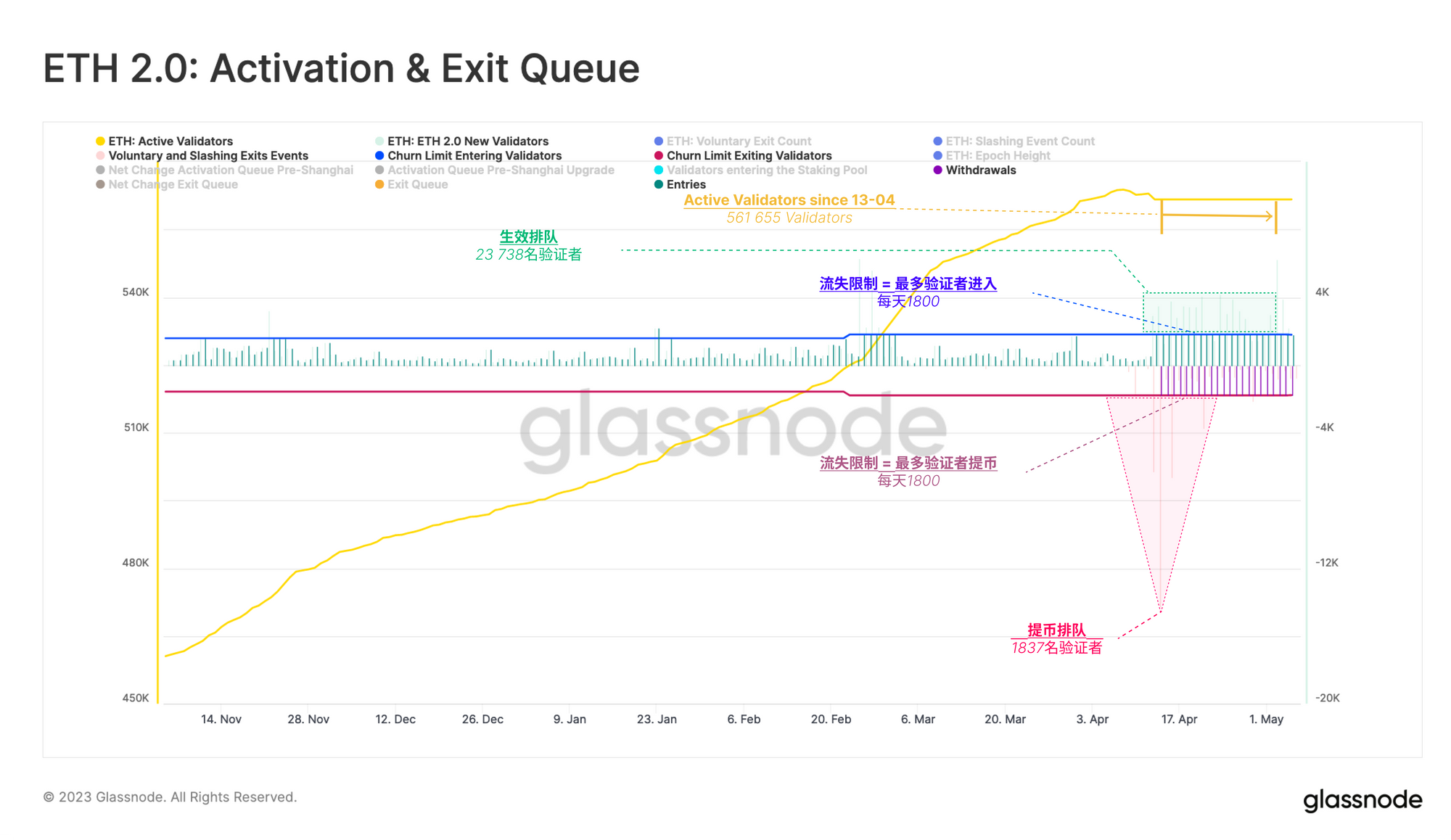 在等式的另一边,我们发现超过23000个验证者在激活群组中排队等待,而退出群组已经缩减到只有1837个。观察这两个不同的群组,我们看到退出事件被新的存款所抵消,导致活跃验证者数量的净变化为零。