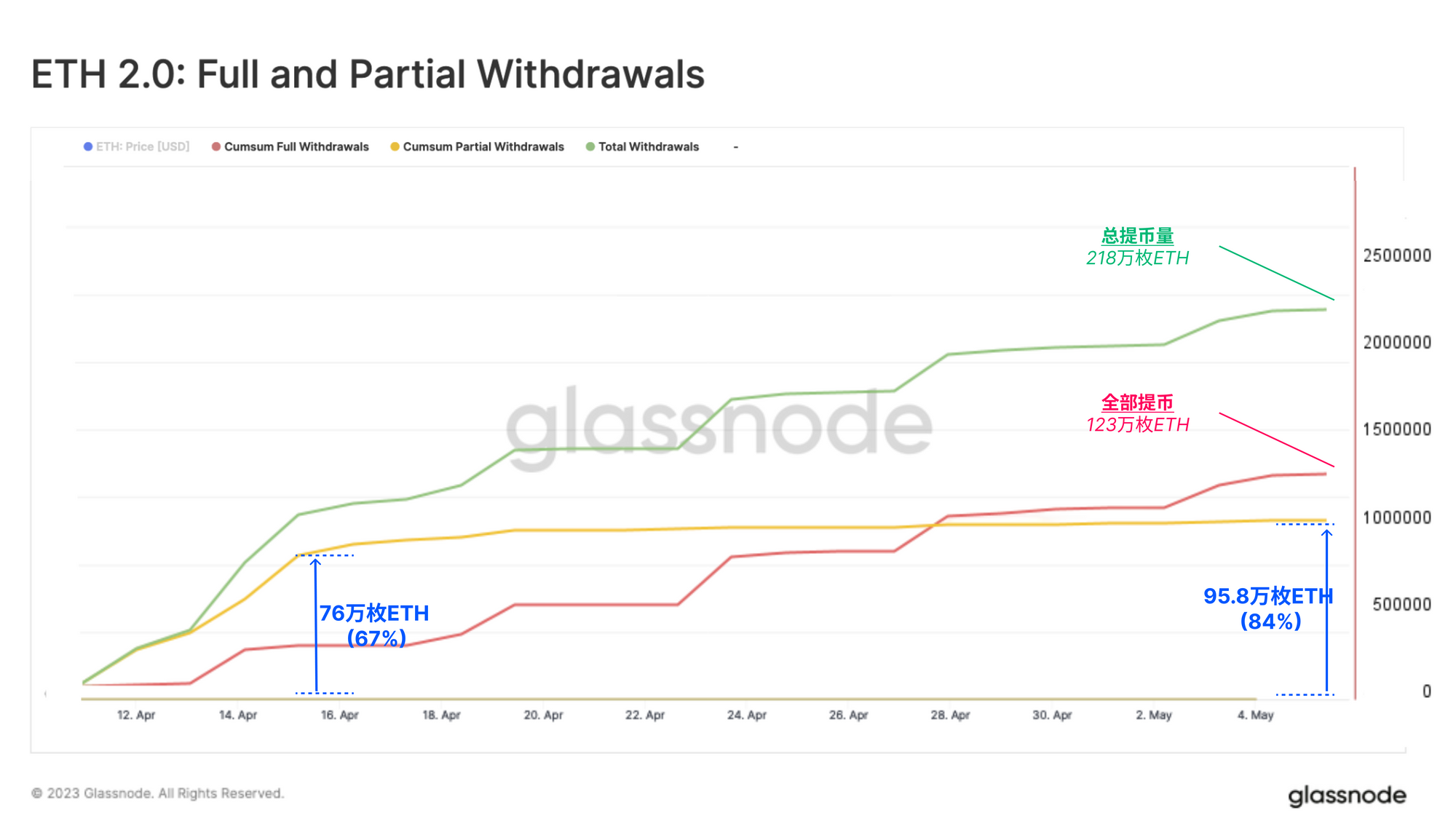 实际数字介于我们的估计和最大可能的数额之间。在第一周,有85.6万枚ETH奖励,总共有23.2万枚ETH被解锁。部分提币占释放ETH总量的80%。