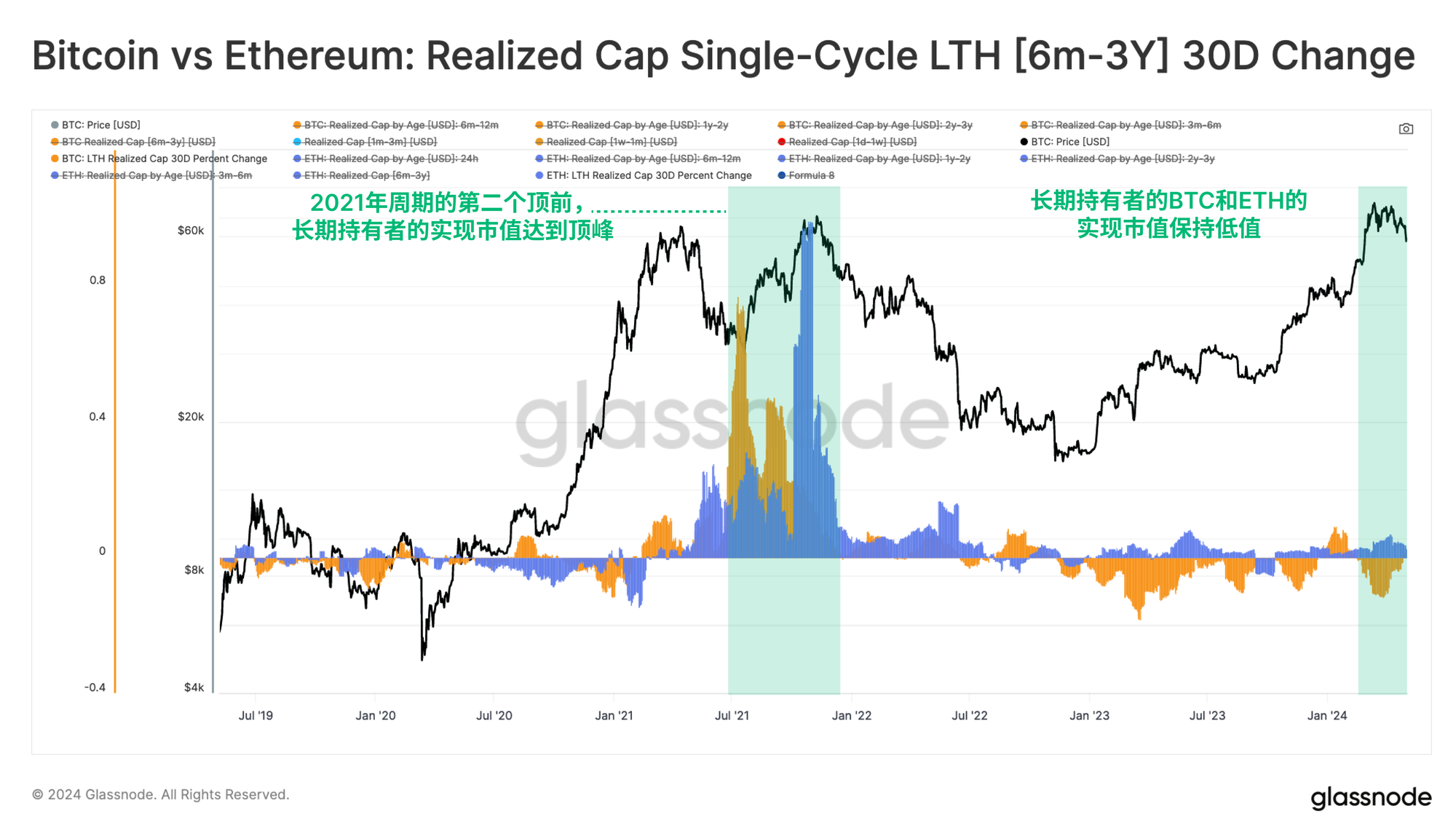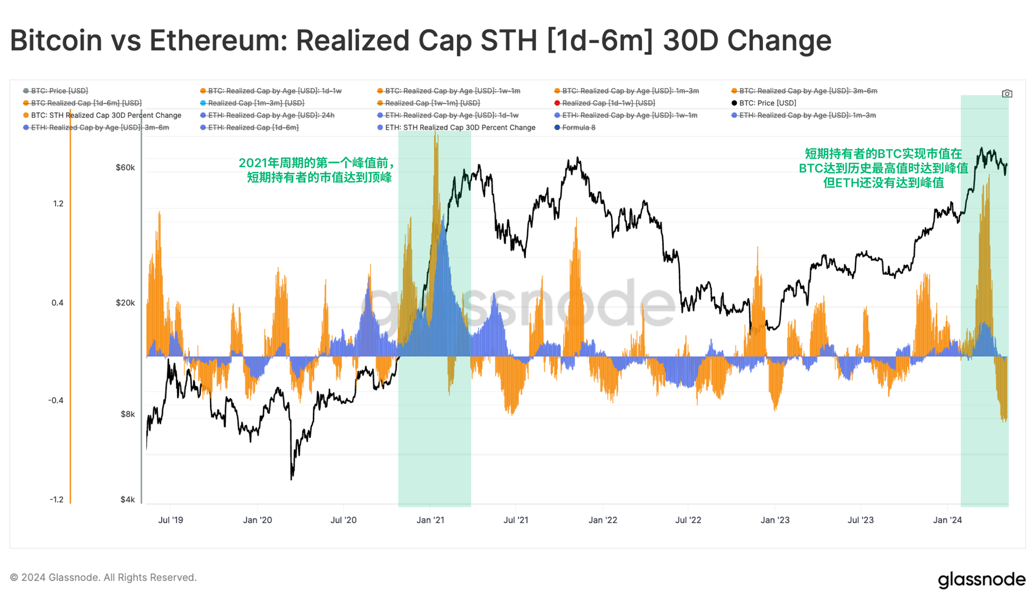 在这个例子中,我们将这一指标细分为短期持有者和长期持有者。对于这两种资产,短期持有者变量在2021年周期顶点之前达到高峰。今年,比特币短期持有者的实现市值在新的历史最高点附近达到高峰,而以太坊的相关指标几乎没有上升。