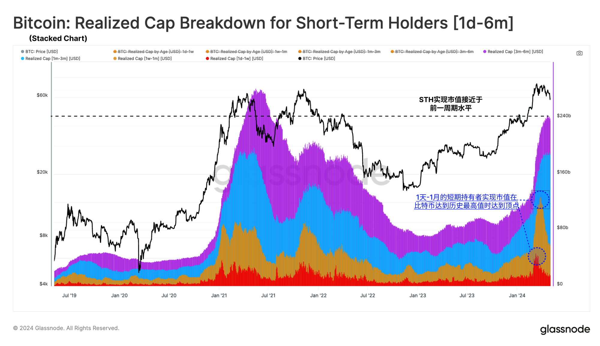 在比特币达到3月14日的历史最高价(ATH)的前期,投机活动明显增加。具体而言,在过去6个月内转移的币中持有的美元财富接近2400亿美元,接近历史最高水平,我们观察到短期持有者的资本在积累。