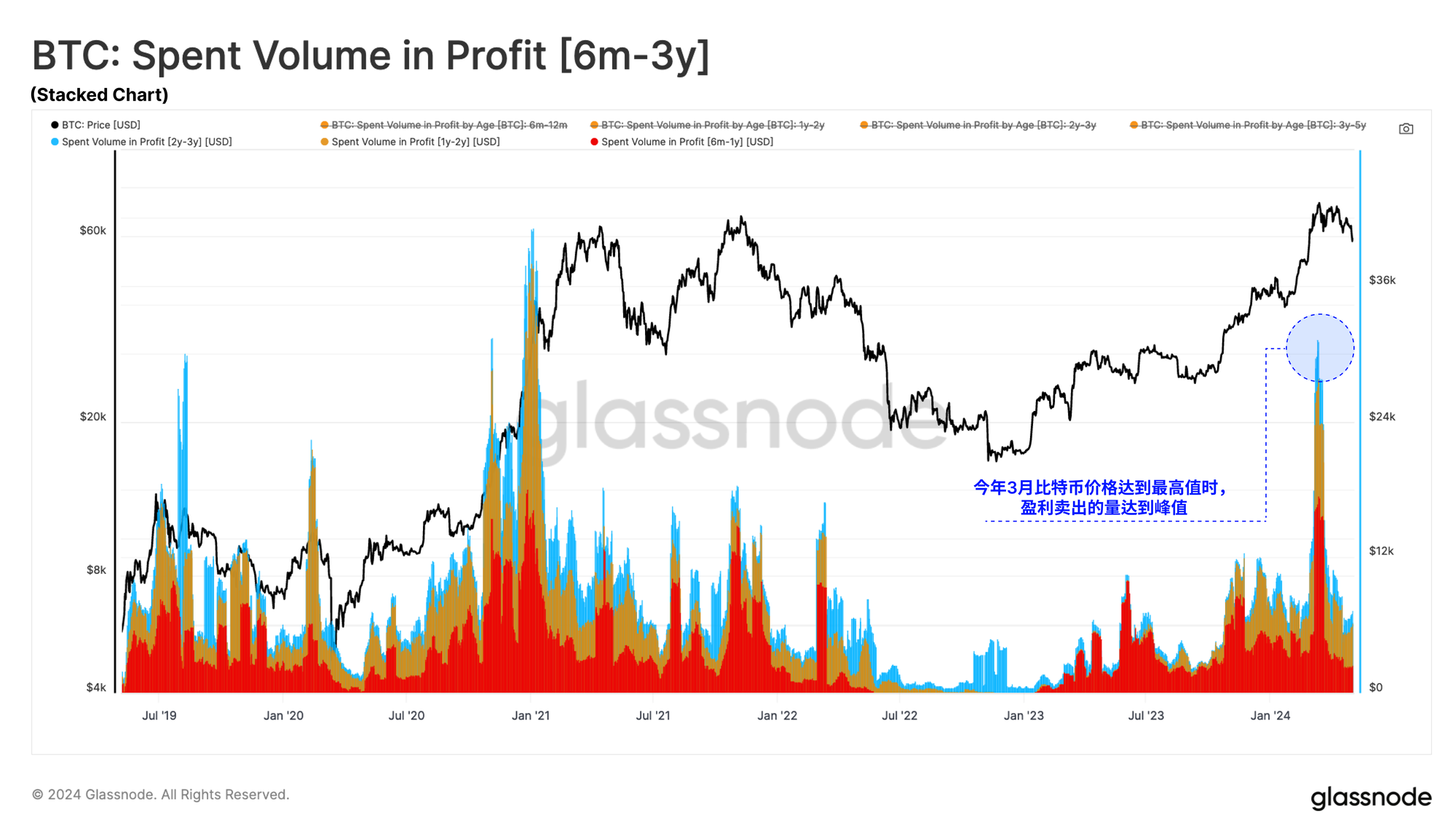 如果我们检查长期持有者的利润中的卖出量,我们可以看到持有6个月至2年的比特币持有者在历史最高价期间增加了撤资。