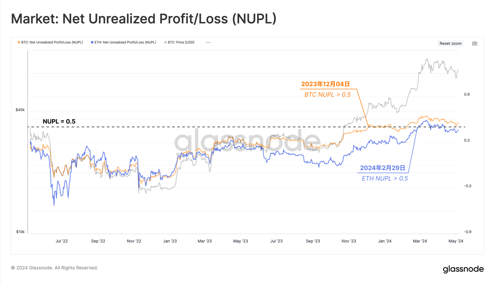 为了比较比特币和以太坊之间的相对表现,我们可以查看净未实现利润/亏损(NUPL)指标。比较NUPL可以让我们看到与每种资产的平均链上成本基础相比,比特币和以太坊投资者的盈利情况。