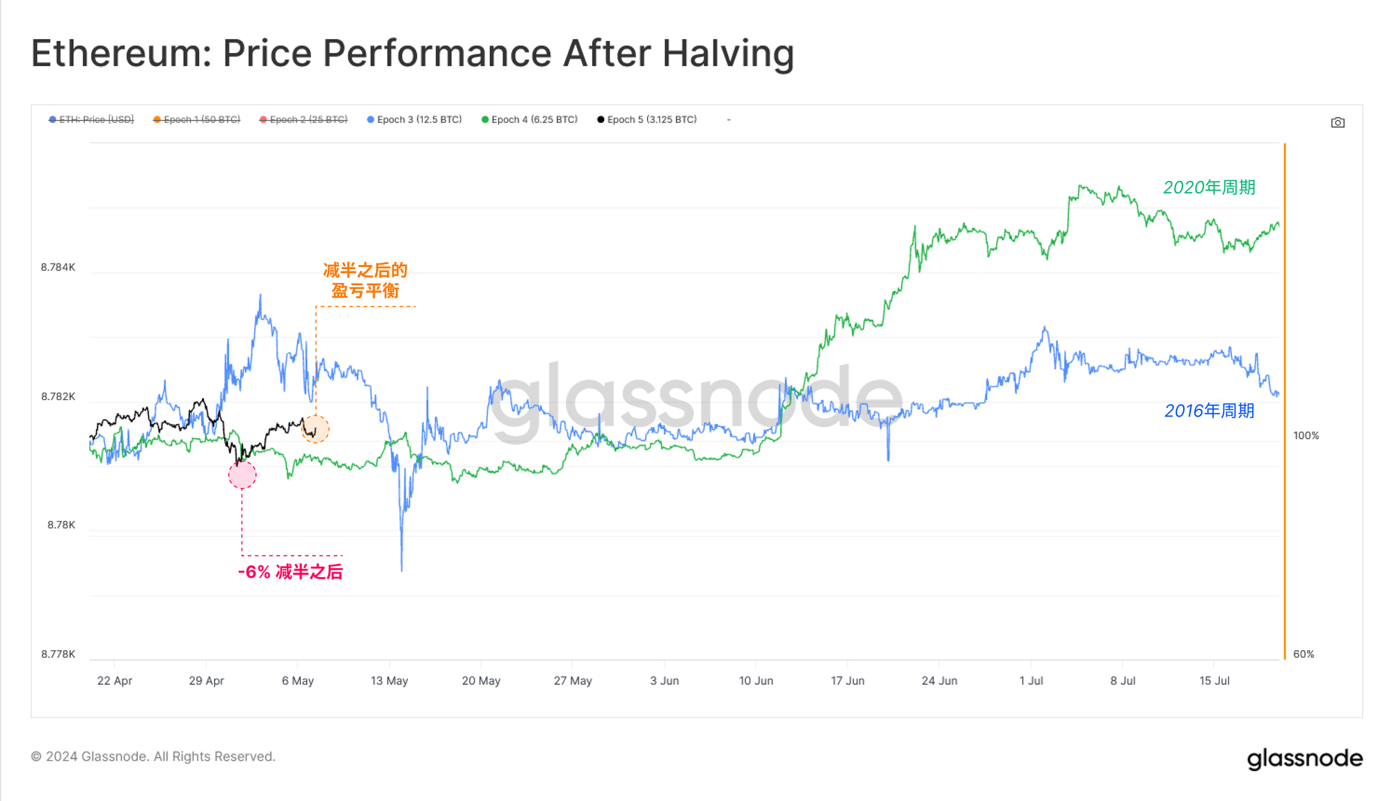 以太坊的价格也感受到了类似的重力,比特币减半后立即跟随比特币价格下跌,并录得了有史以来最糟糕的减半后表现。然而在接下来的几天里,以太坊的价格也有所恢复,使得整体表现转入正向区域。