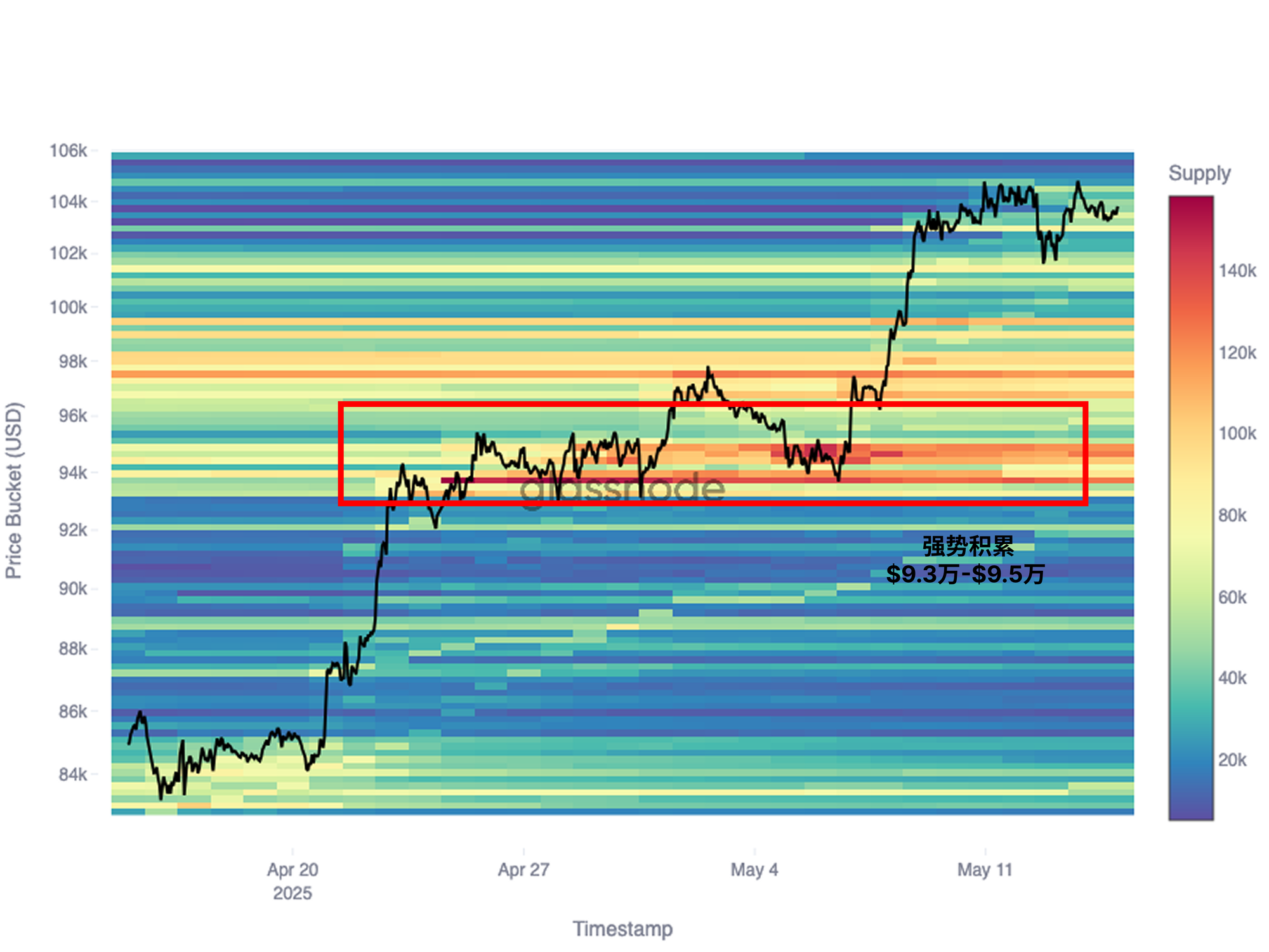 着眼于过去 30 天,我们还可以看到在 9.3 万美元至 9.5 万美元之间出现了一个关键的吸筹区域。该区间与短期持有者成本基础高度一致,代表了在过去 155 天内进入市场的投资者。