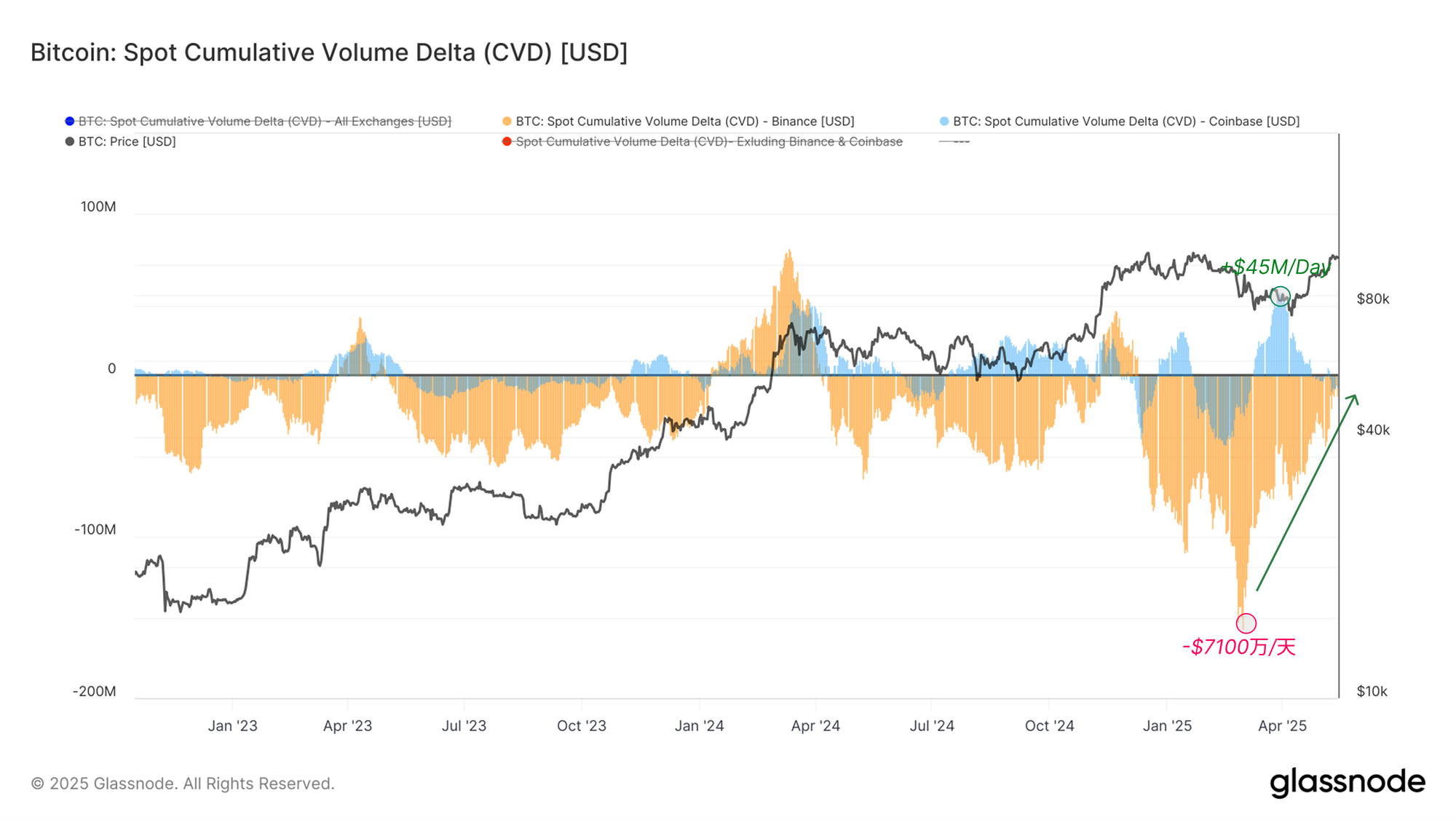 下图突出了币安和 Coinbase 的现货 CVD 指标。自四月中旬以来,Coinbase 经历了持续的净买入状态,CVD 峰值达到每天 +4500 万美元,这与市场加速上涨相一致。相比之下,币安市场已从三月中旬每天 -7100 万美元的剧烈净卖出压力,转变为今天的每日 -900 万美元的温和水平,反映出卖方压力的显著缓解。