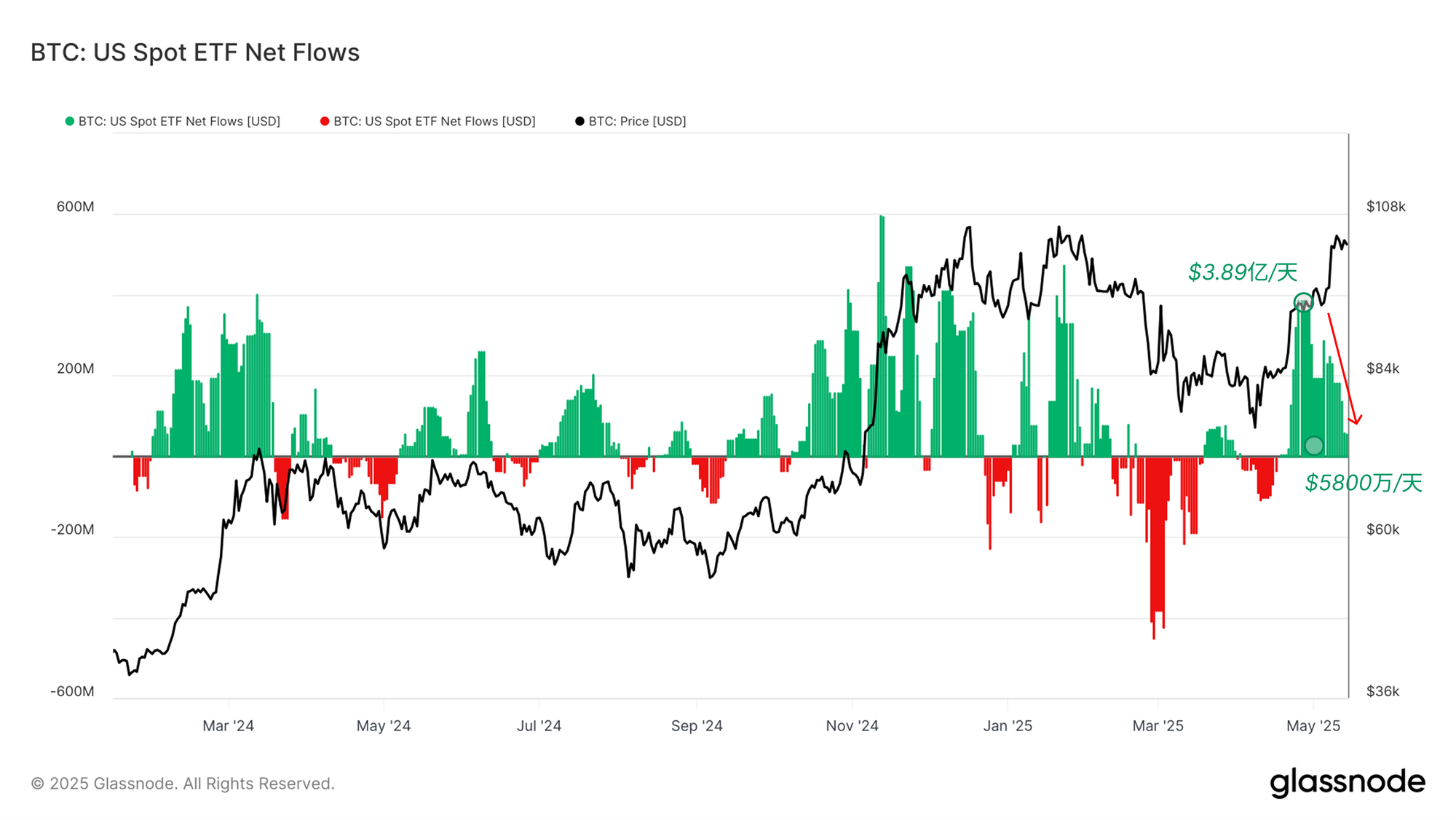 传统投资者对比特币市场的参与度不断提高,尤其是在现货 ETF 推出以来。监测这些产品的资金流入和流出可以为机构的情绪、信念和需求提供有价值的视角。值得注意的是,4月25日,ETF 钱包的每周平均净流入量达到峰值 3.89 亿美元/天,这与现货驱动型买盘的激增相吻合,并支撑了向 10.4 万美元的上涨。此后,ETF 资金流入已降温至每天约 5800 万美元。