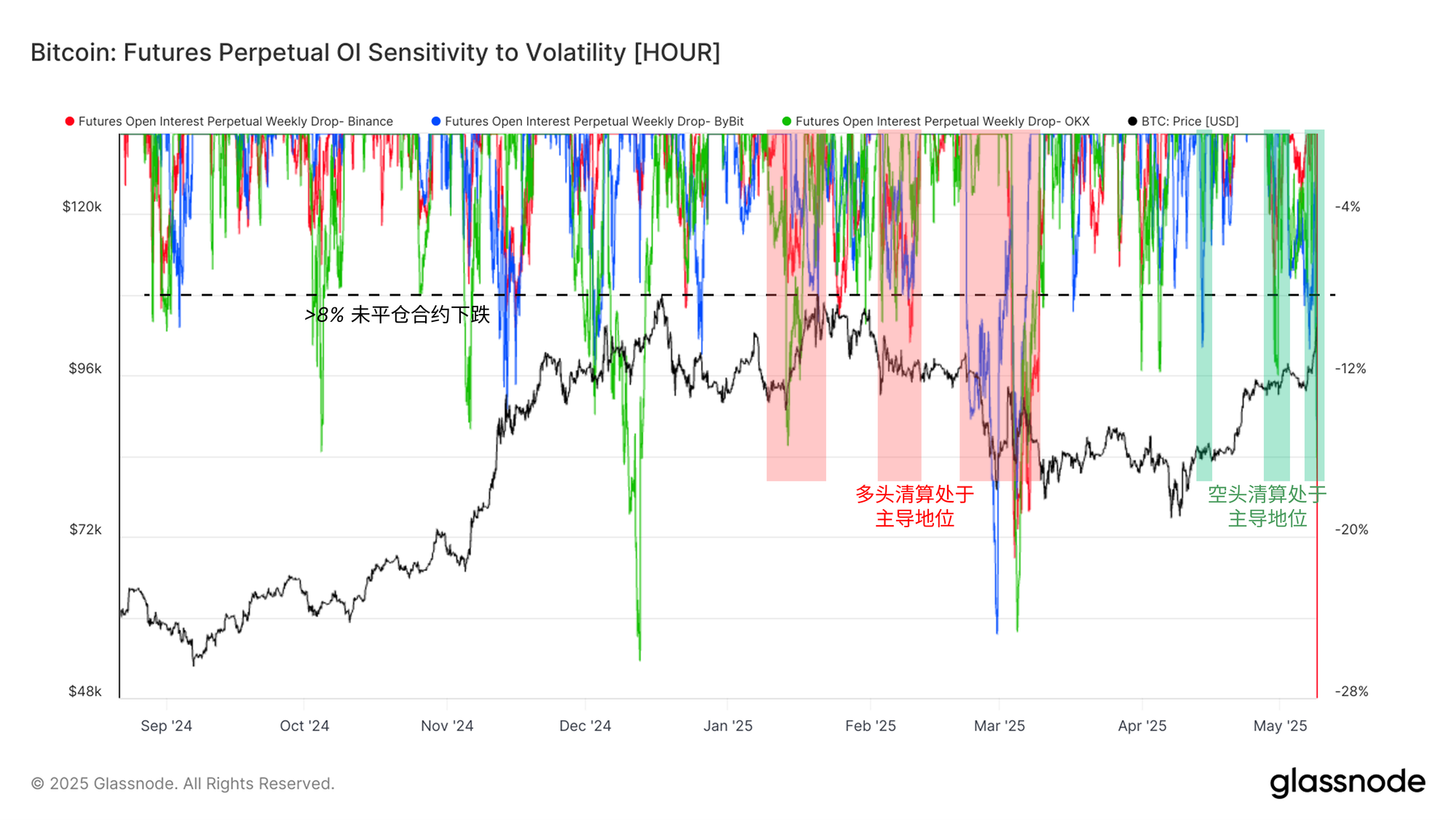 自 2025 年 1 月以来,该指标已显示出其在识别投资者对市场走势感到意外的点的效用,他们经常被挤出头寸。在价格跌破 8 万美元期间,市场经历了多次每周超过 10% 的未平仓合约收缩。这是一个明显的迹象,表明随着价格接近清算水平,过度杠杆化的多头头寸正被强制平仓。