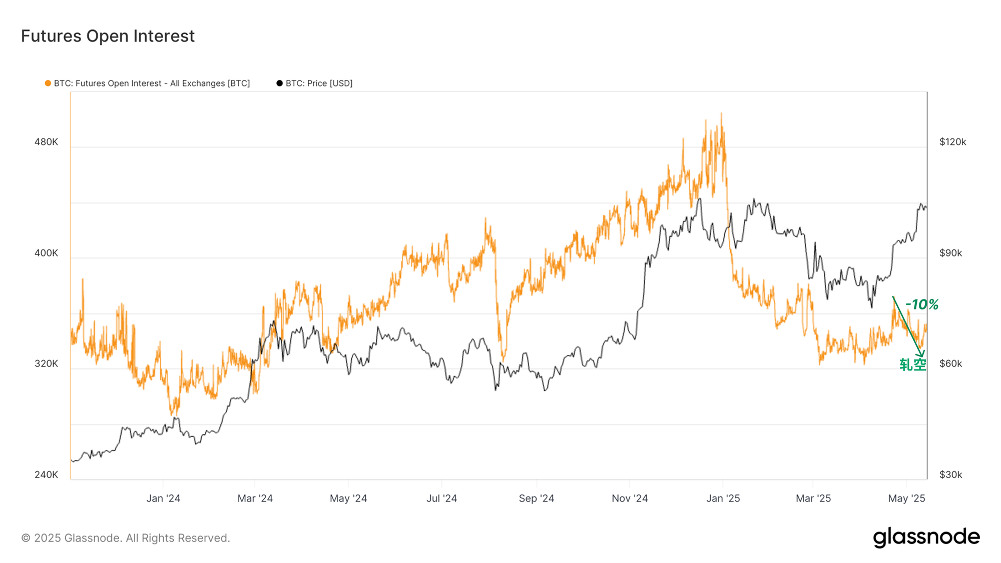 随着杠杆空头头寸被清除,期货未平仓合约下降了 -10%,从 37 万枚 BTC 降至 33.6 万枚 BTC。这种减少让我们对空头挤压的规模有了一个概念。这个过程也降低了不健康的去杠杆化事件发生的可能性,并可能缓和近期价格波动带来的潜在波动性。