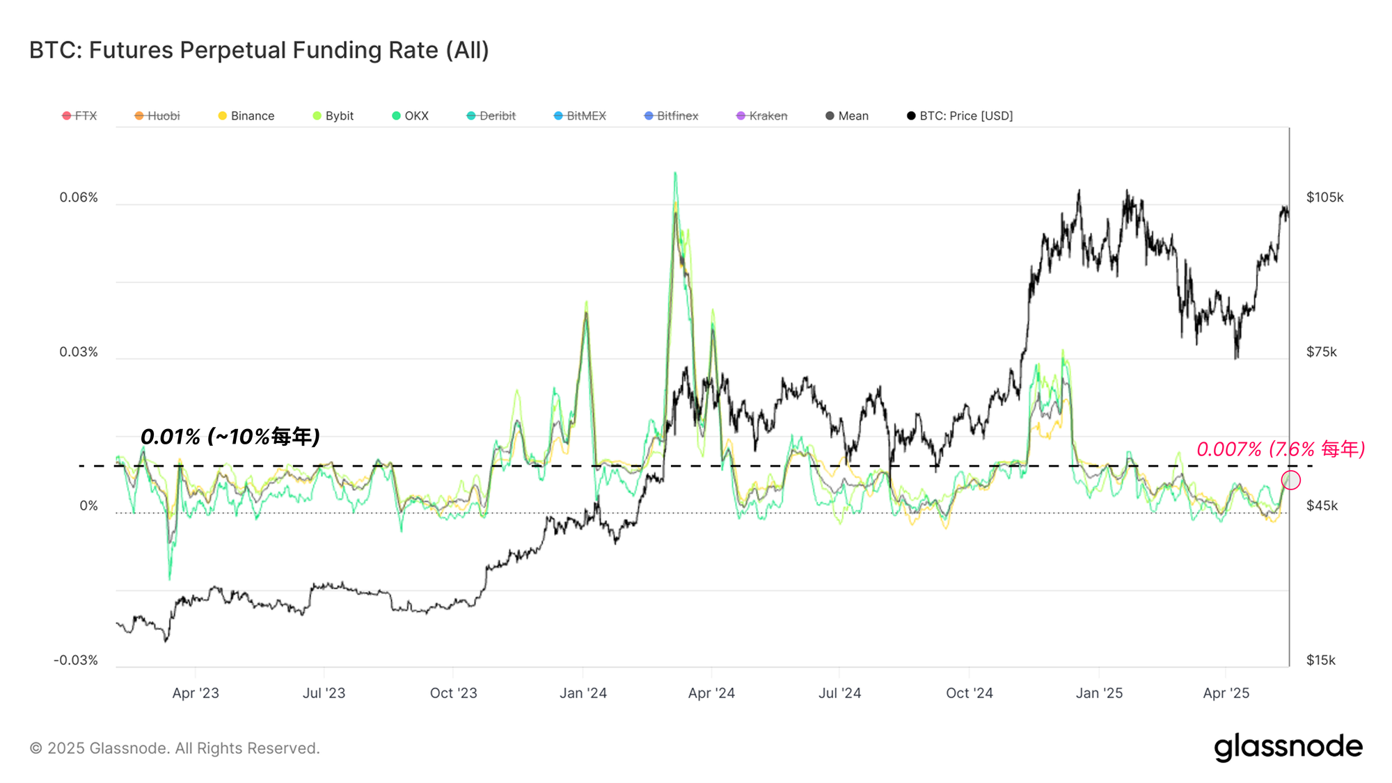 如下图所示,自四月下旬以来,平均和个别资金费率一直在稳步回升,目前徘徊在 0.007% 左右(年化 7.6%)。这种上升反映了一种建设性的转变,表明永续合约市场对多头敞口的兴趣并不过度。目前看来,市场上的多头杠杆有限,这是一个健康的迹象。