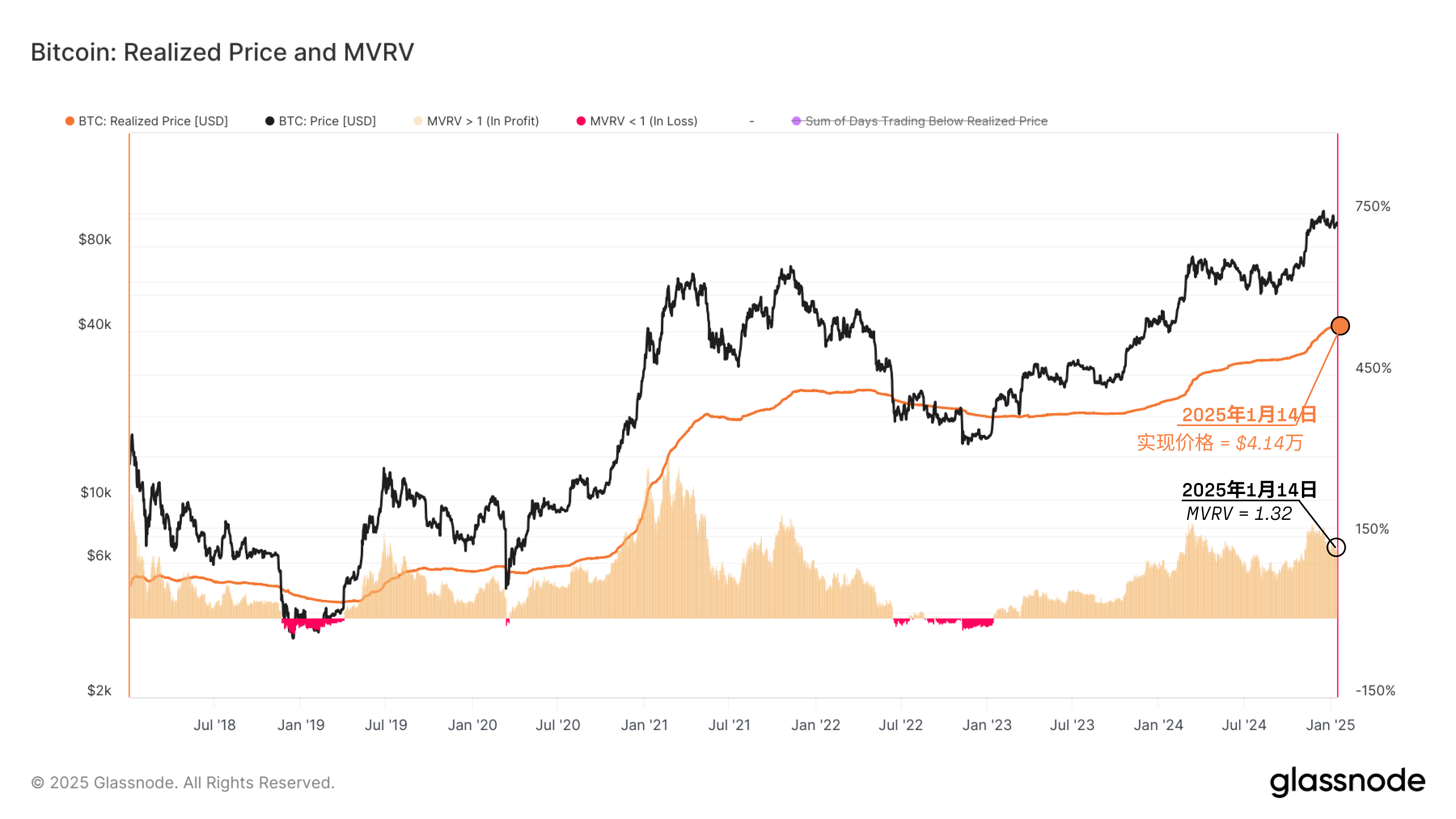已实现价格反映了所有比特币最后一次在链上移动的平均价格,因此代表了市场的整体成本基础。MVRV 比率是现货价格与已实现价格之间的比率,用于衡量平均持有的未实现利润的大小。当数值高于1时,表示整体处于未实现利润;低于1则表示未实现亏损。
