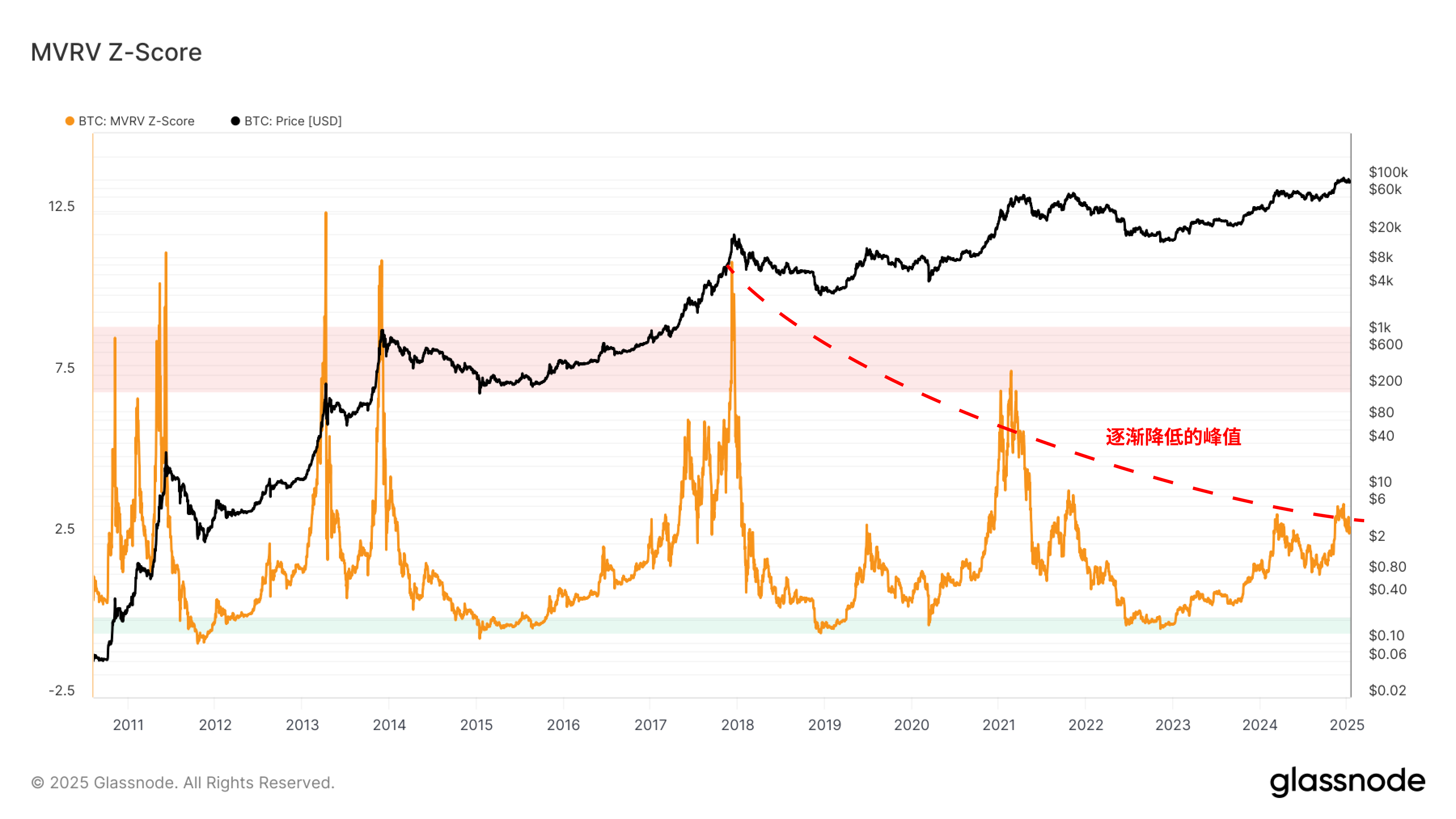 为了说明 MVRV 在多次周期中峰值逐渐减弱的现象,我们可以运用统计方法来对其波动范围进行归一化处理。在金融时间序列分析中,一个被广泛接受的方法是使用 Z-Score,其计算公式如下: