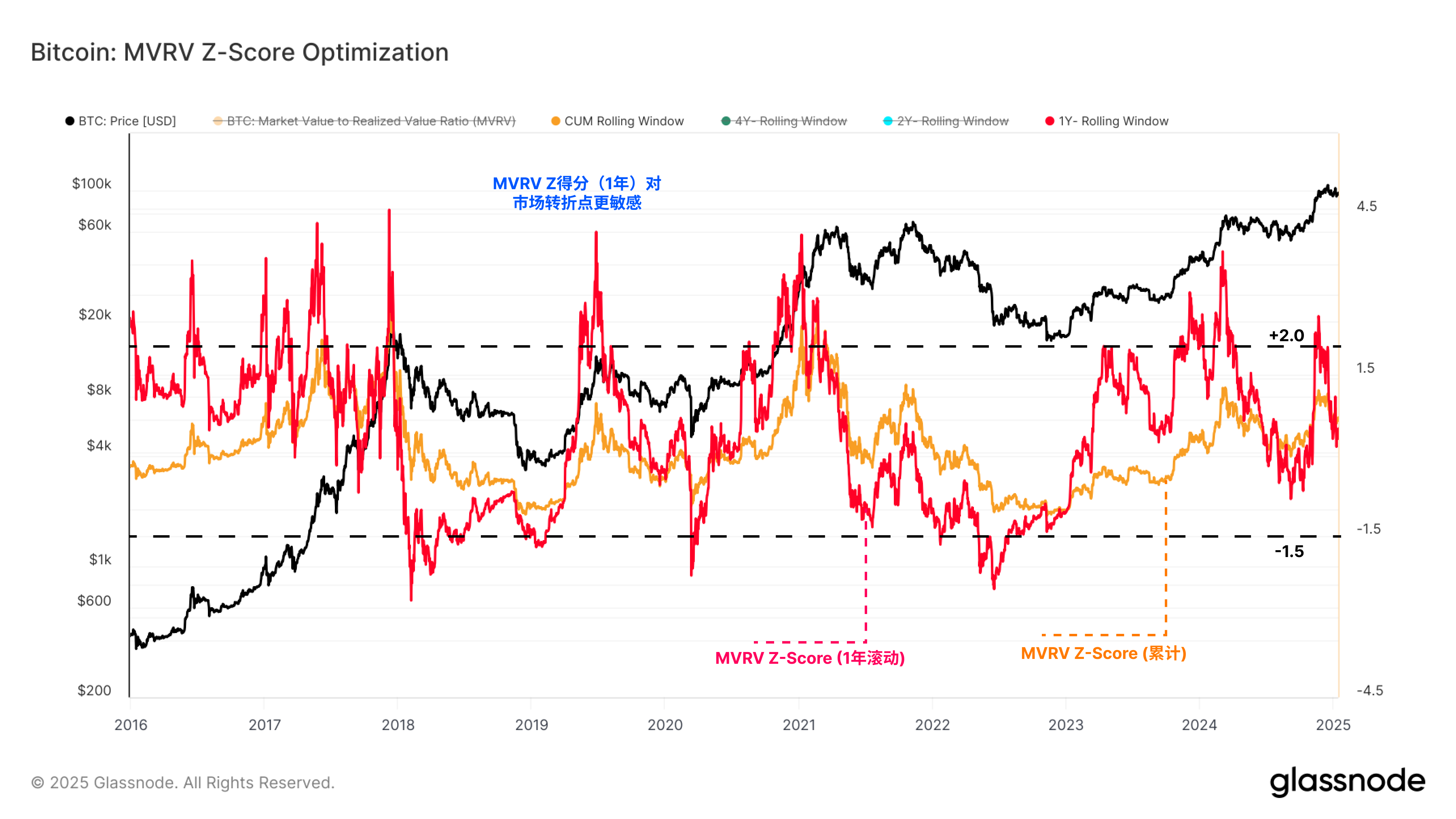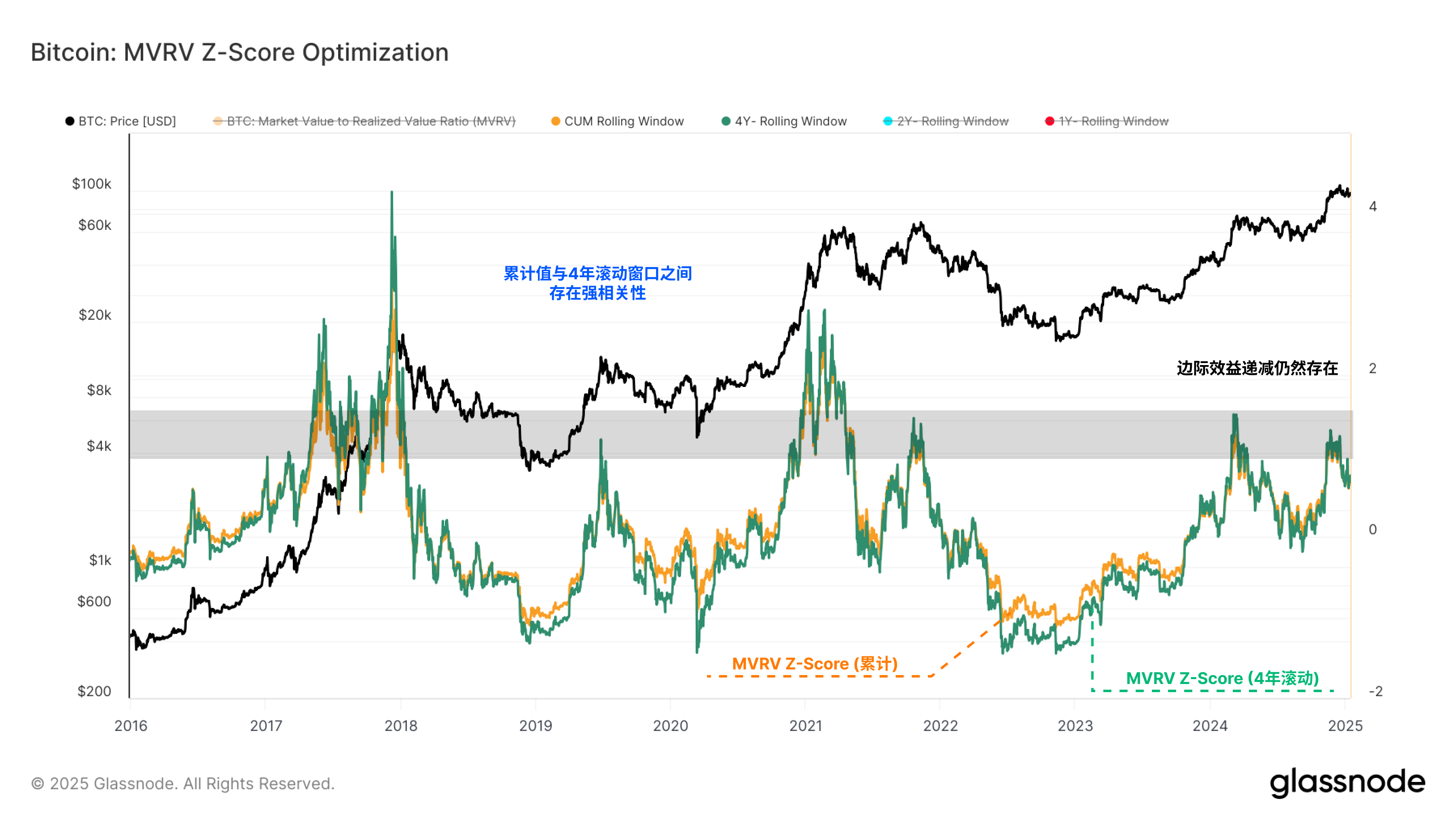 在计算 Z-Score 时,我们既可以使用整个历史数据集以获取累积视角,也可以采用更短的滚动窗口,以更好地捕捉金融周期的动态特性以及 MVRV 峰值逐渐减弱的趋势。
