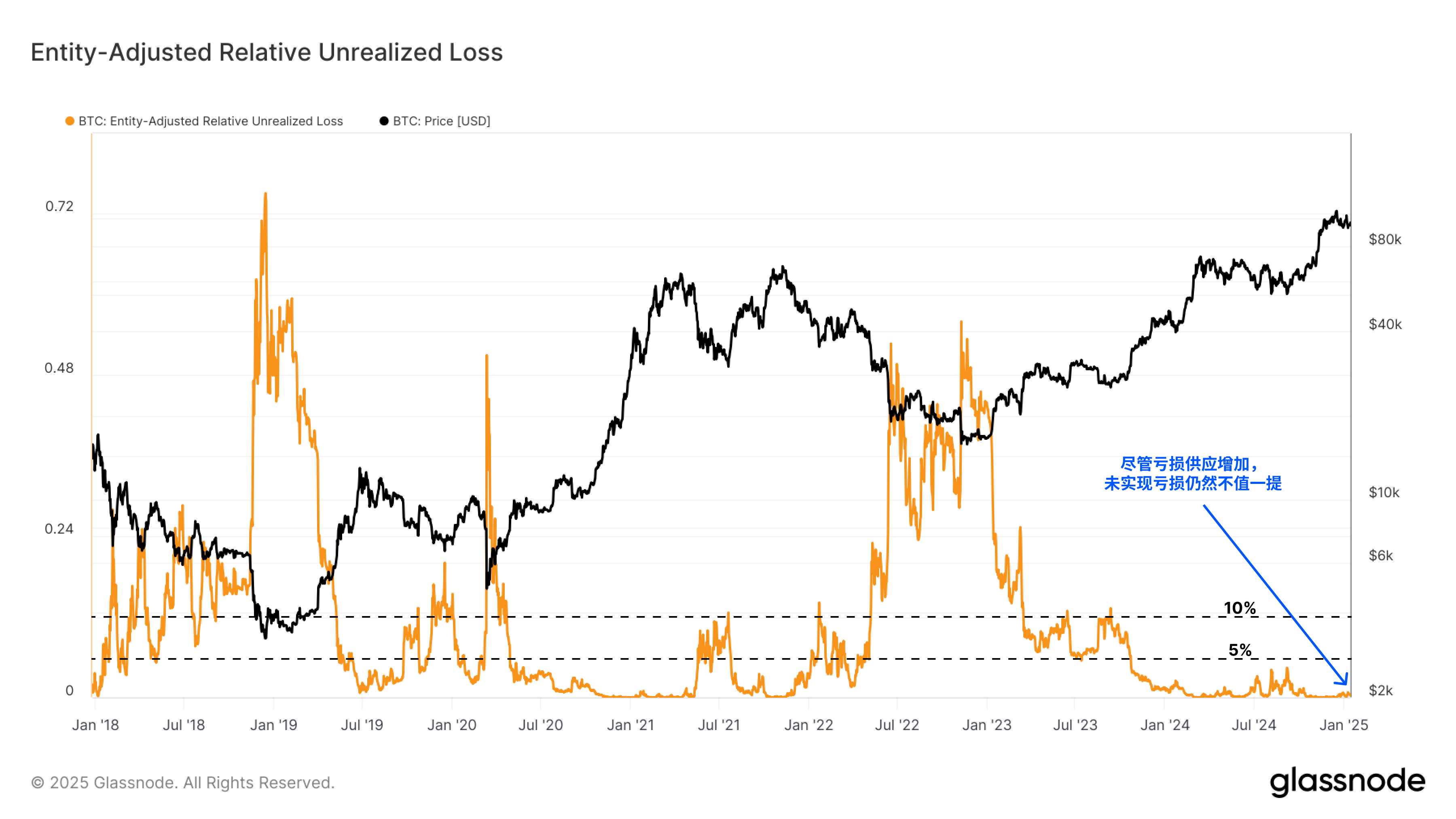 随着比特币市场从10.8万美元的历史高点回调,市场中大量的泡沫已被挤出,而需求依然相对强劲。未实现亏损主要集中在短期持有者手中;然而,与以往的回调相比,市场压力相对温和。