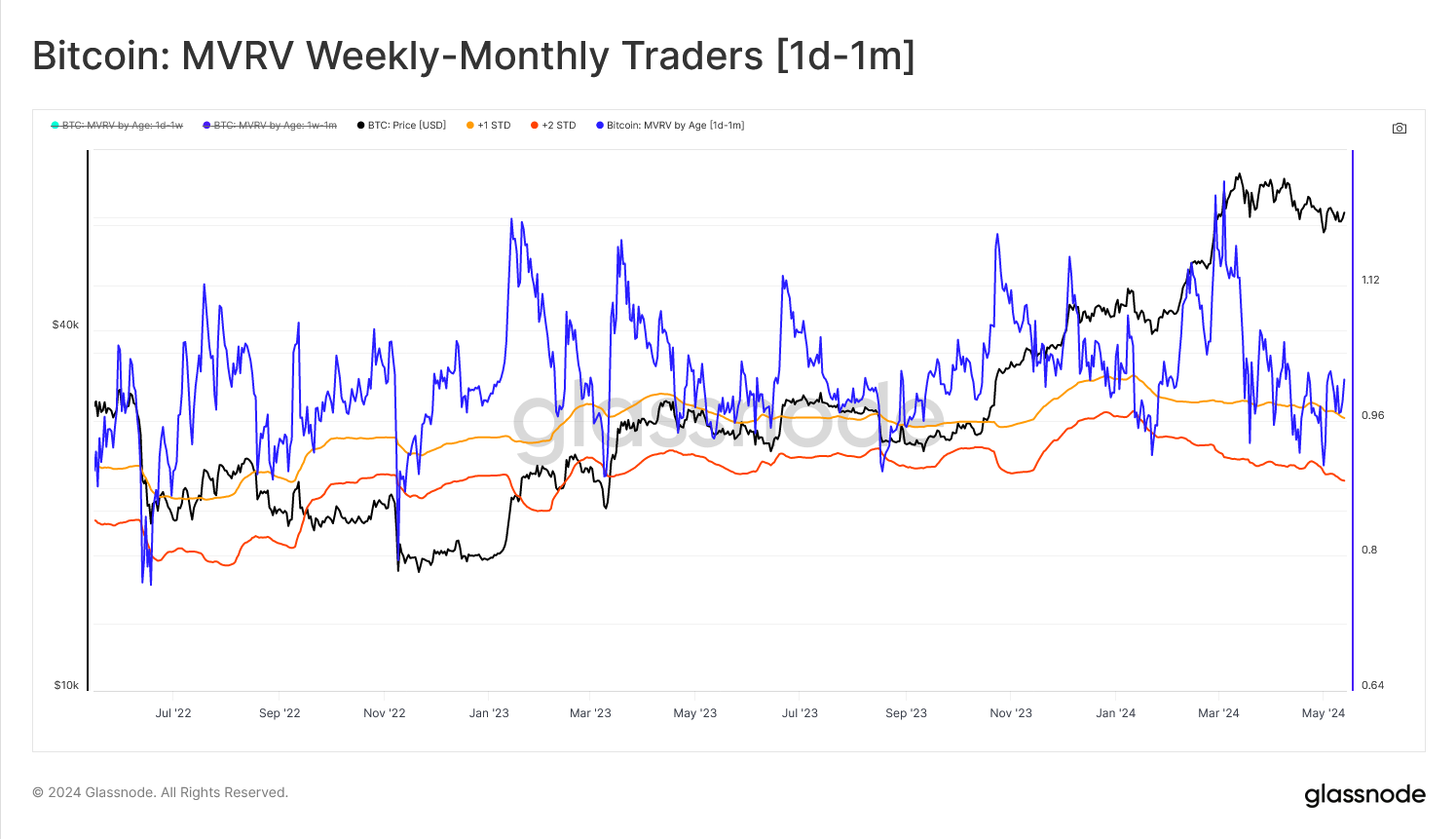 接下来是每周-每月交易者,我们首先观察到信号的振荡明显减缓。这是预期的结果,因为我们扩展到更长期的币龄带,平均成本基数被平滑。这一群体对价格的敏感度低于日交易者群体,但由于现货价格在其持有期内围绕其成本基数波动,他们也更有可能经历波动。