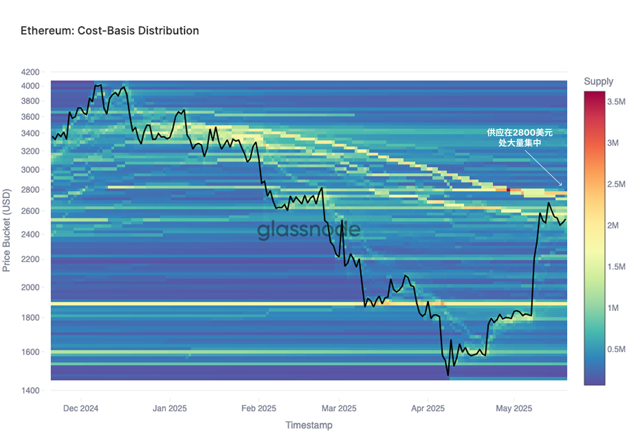 在检查以太坊的成本基础分布概况时,我们可以发现其一致性。目前,投资者成本基础水平在2800美元附近高度集中。该区域可能会吸引更多的卖方压力,因为许多此前处于亏损状态的投资者可能会寻求在盈亏平衡点或附近去风险,并获利了结。