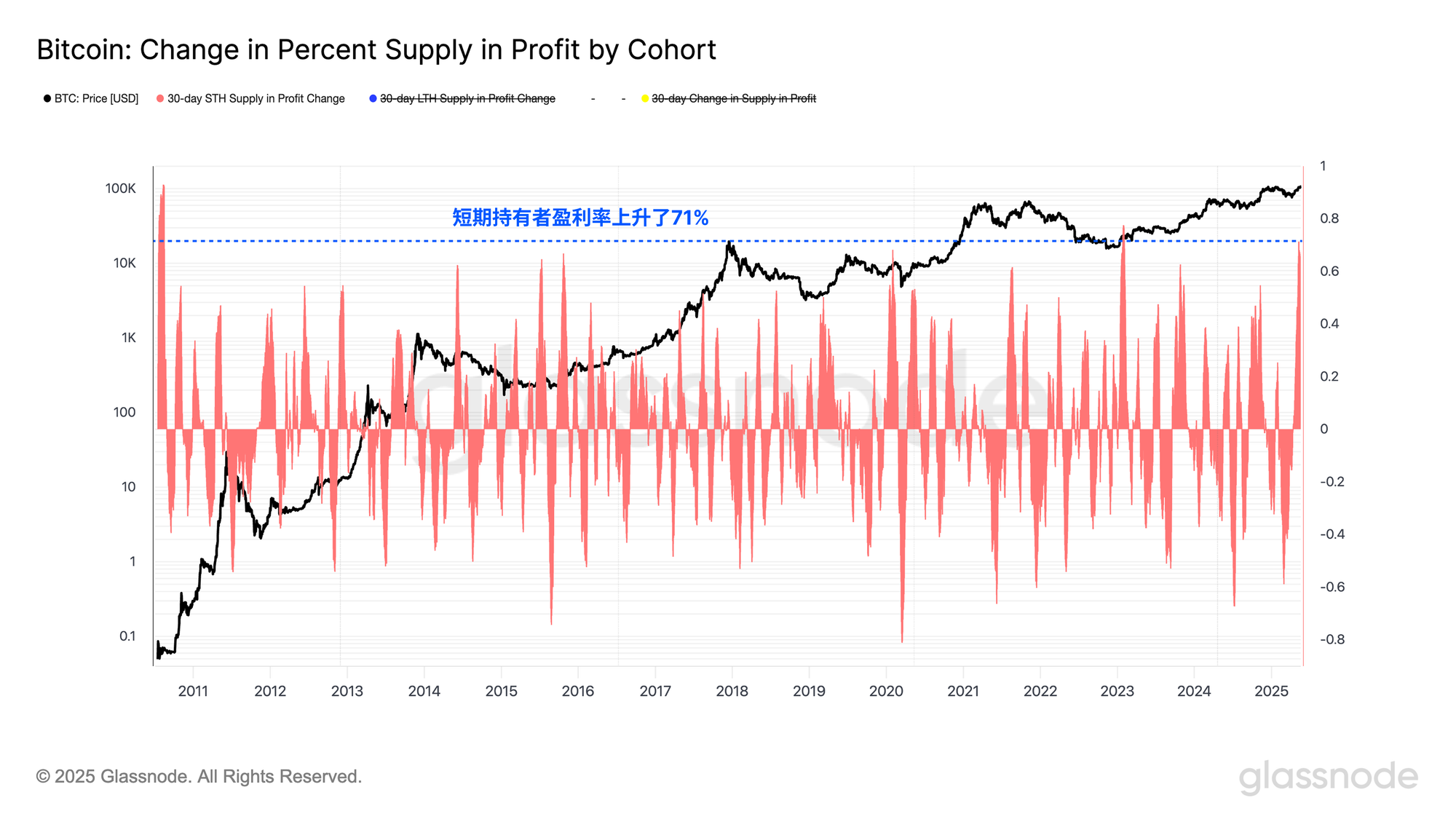 近期价格上涨为短期持有者群体带来了显著的财务缓解,他们在过去一个月内盈利供应的百分比增加了71%。这标志着该群体盈利能力有记录以来第二大积极增长。