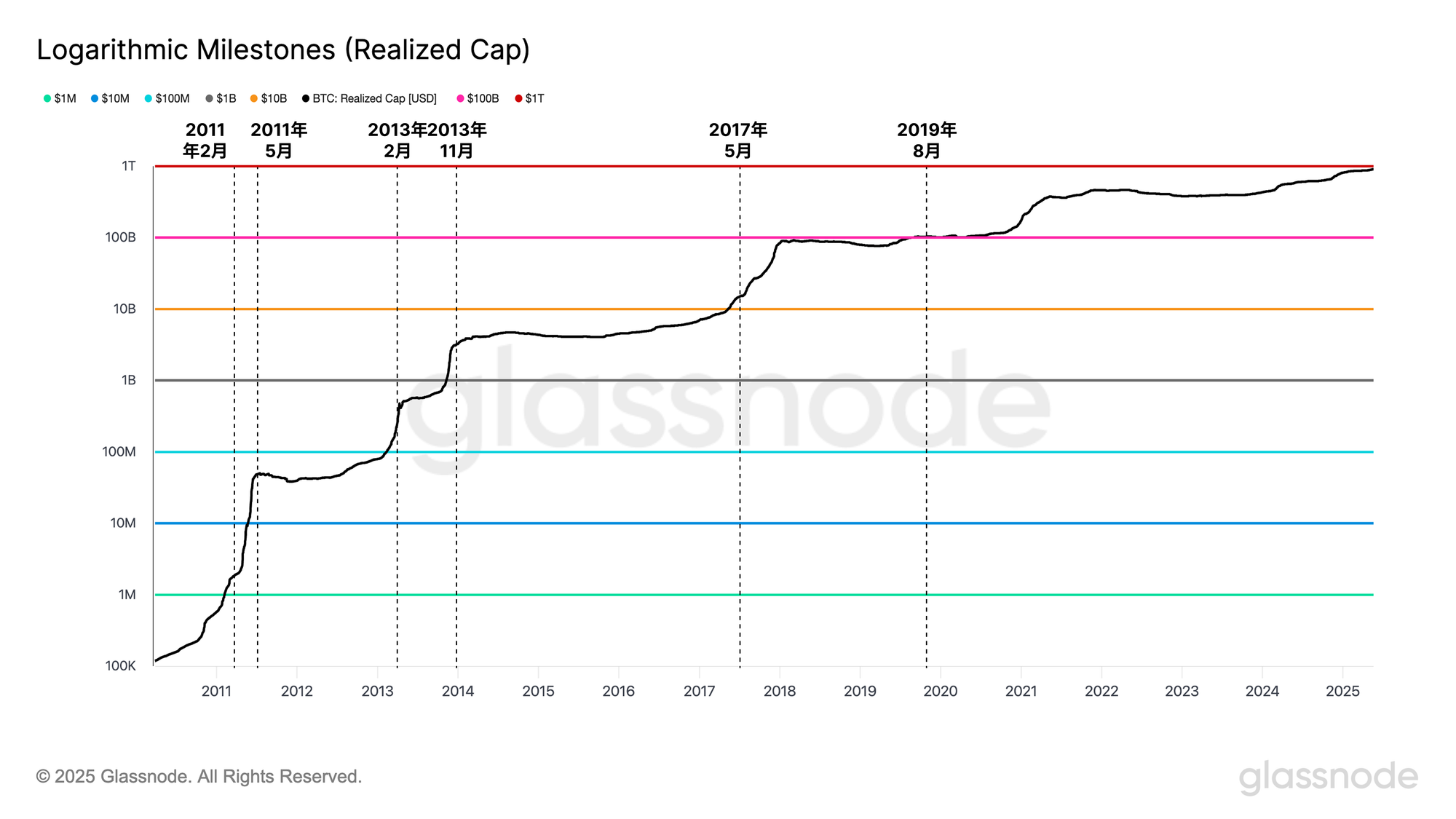 在2011年至2013年间,已实现市值从100万美元增至10亿美元以上,在两年时间内跨越了四个对数里程碑。比特币当时远比现在小,并在网络初始引导阶段经历了指数级增长。下一个重要的100亿美元里程碑花了三年半时间,直到2017年中期已实现市值才达到100亿美元。