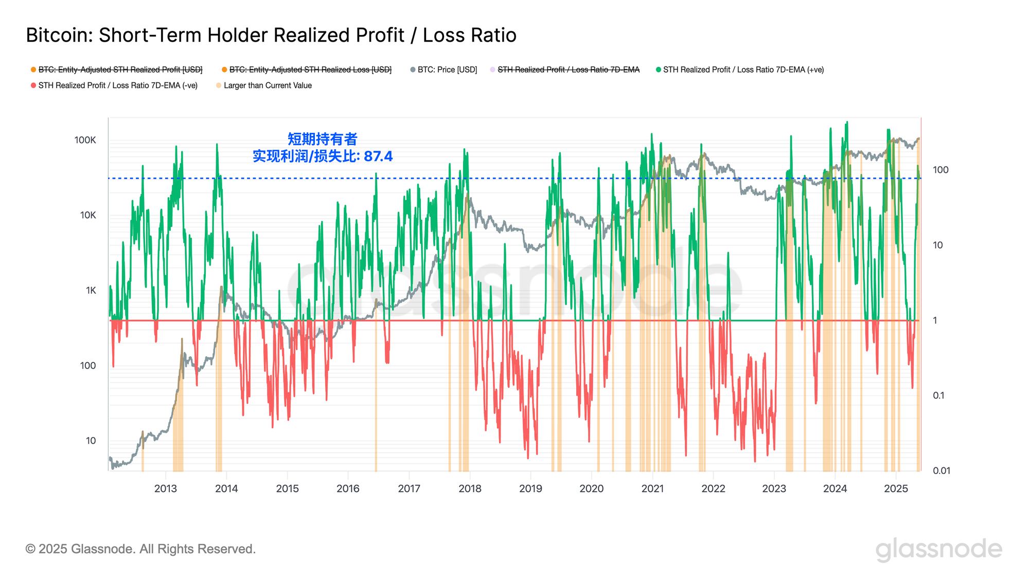 这一转变导致短期持有者已实现盈亏比大幅飙升。现在短期持有者的已实现利润量大大超过了已实现亏损,以至于只有8%的交易日盈亏比处于更高水平。
