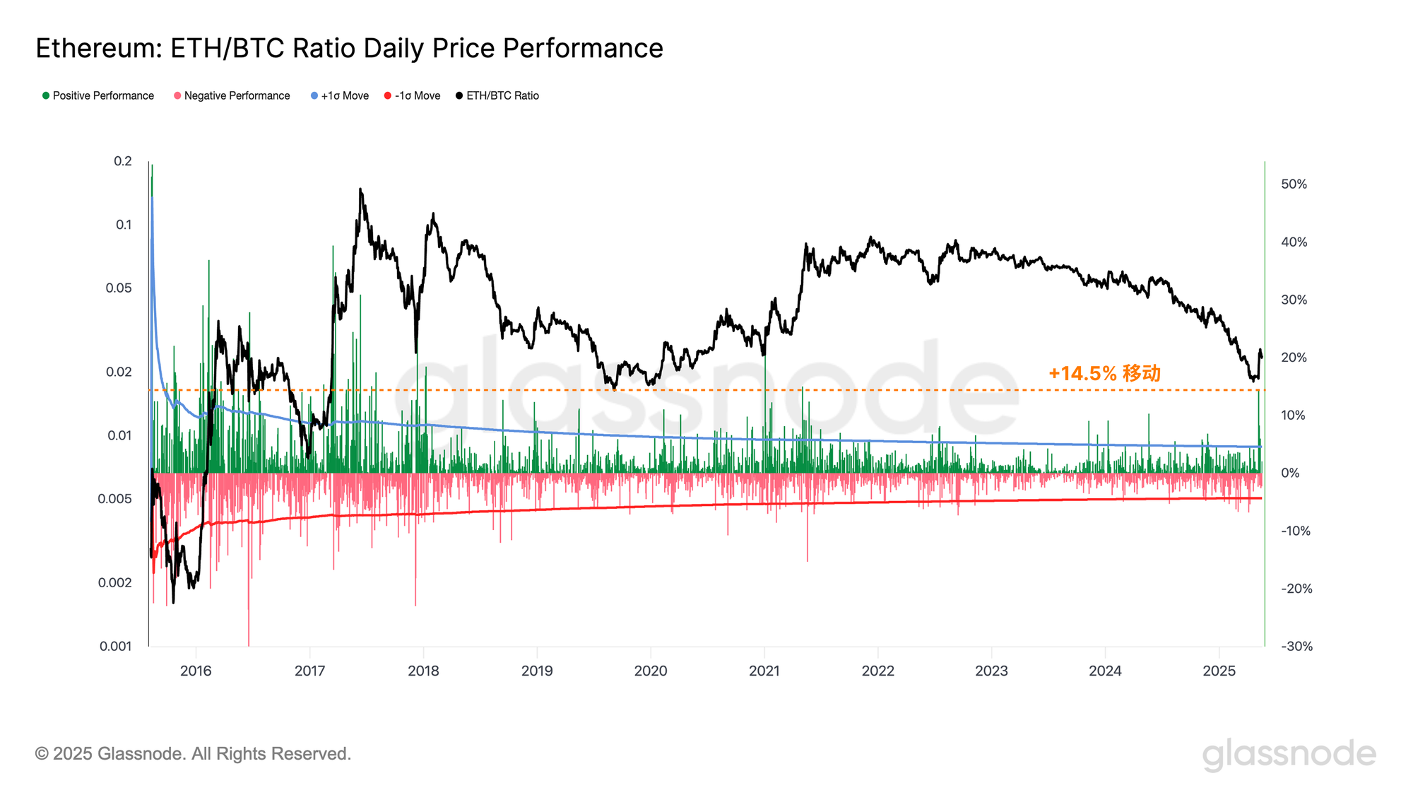 以太坊近期的优异表现导致ETH/BTC比率回升,该比率加速至0.026,增长了14.5%,是有记录以来第46大事件。