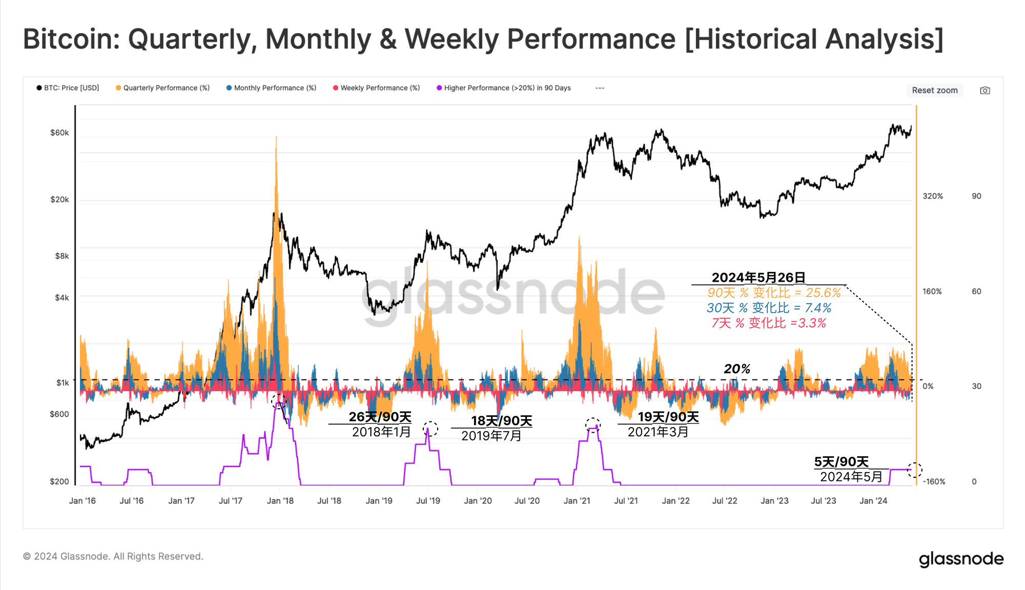 如果我们在周度🟥、月度🟦和季度🟧时间框架内观察比特币市场的滚动表现,比特币整体表现强劲,分别录得+3.3%、+7.4%和+25.6%的增长。