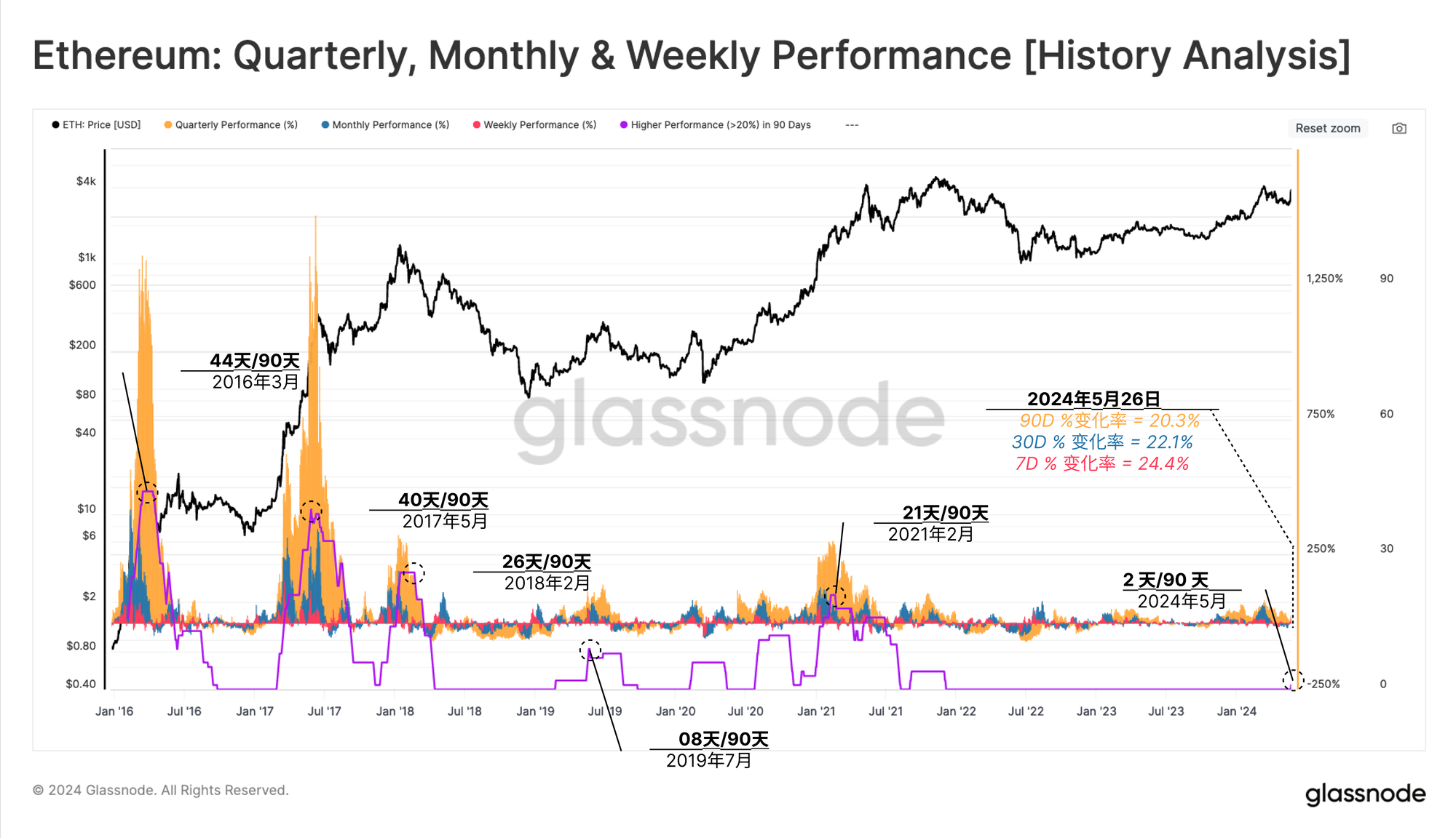 我们可以在类似的框架下评估以太坊,看到ETF批准的显著影响。这一消息几乎立即激发了买盘压力,三个时间框架都录得自2021年底以来首次超过20%的价格变动。