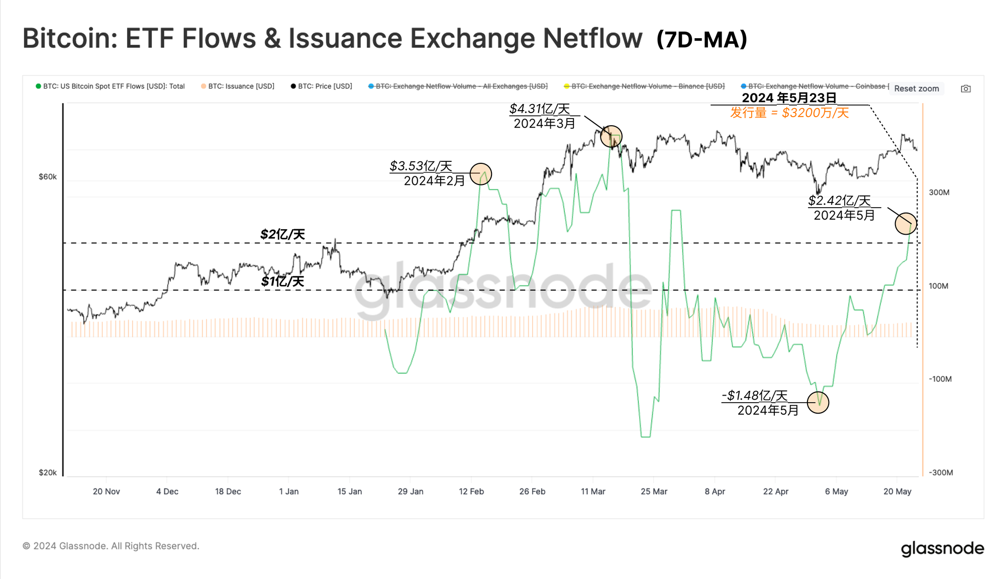 上周,ETF每日净流入显著增加至2.42亿美元,表明买盘需求的回归。考虑到矿工自减半以来每日3200万美元的自然卖压,ETF的买入压力几乎是其八倍。这突显了ETF影响的规模和范围,但也表明未来减半的影响相对较小。