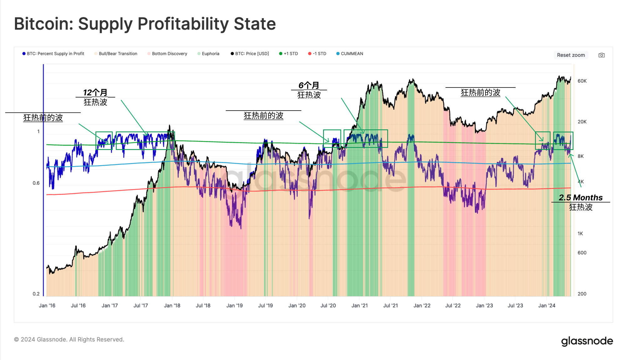当市场突破新的历史高点并进入价格发现阶段时,它进入狂热阶段,盈利供应的百分比在接下来的6到12个月内在90%左右波动。当前的狂热阶段相对年轻,但已活跃约2.5个月,截至写作时,93.4%的供应处于盈利状态。
