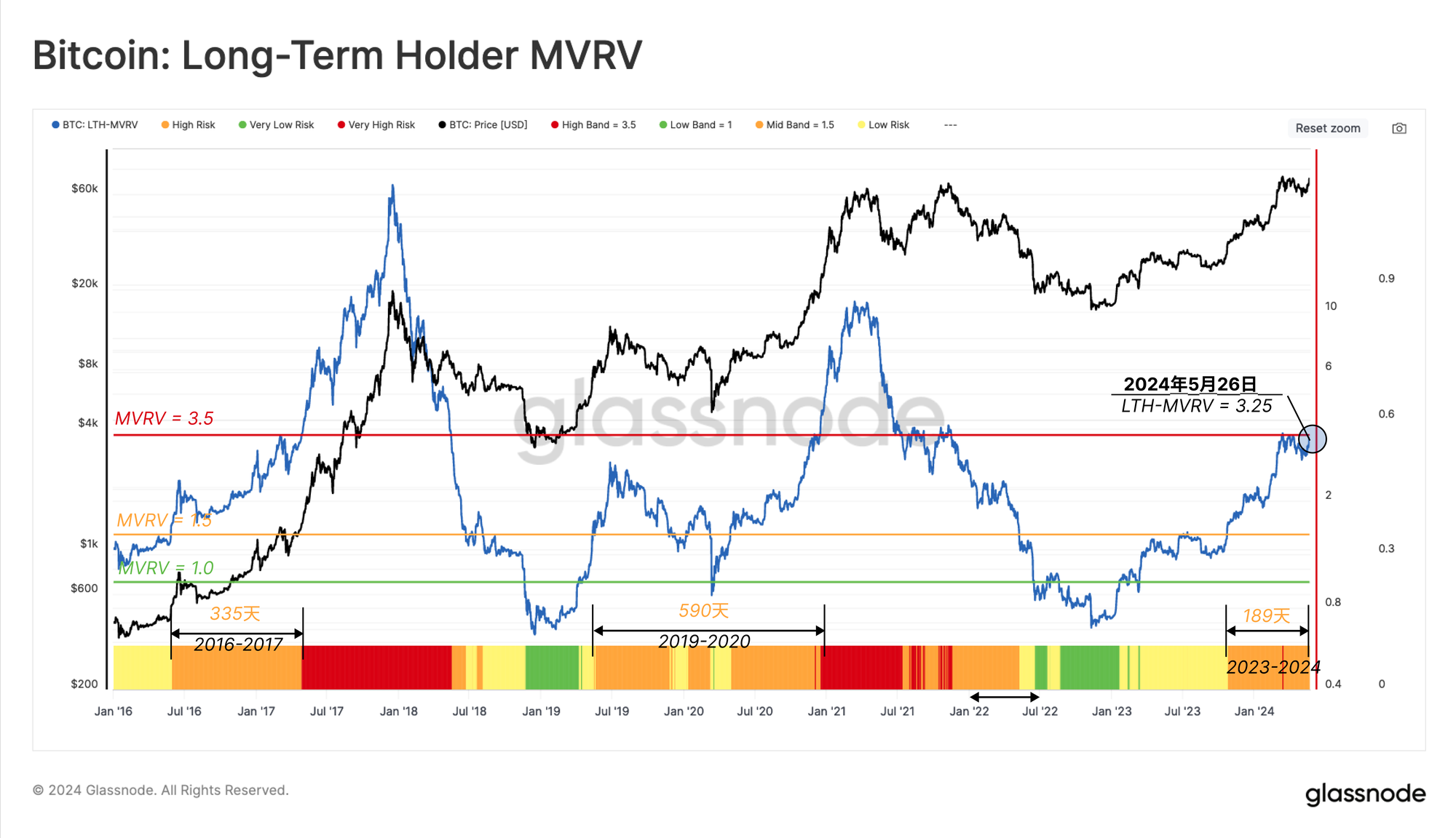 首先,长期持有者的MVRV比率反映了其平均未实现利润倍数。历史上,熊市和牛市之间的过渡阶段看到长期持有者的MVRV比率在1.5到3.5🟧之间波动,持续时间为一年到两年。
