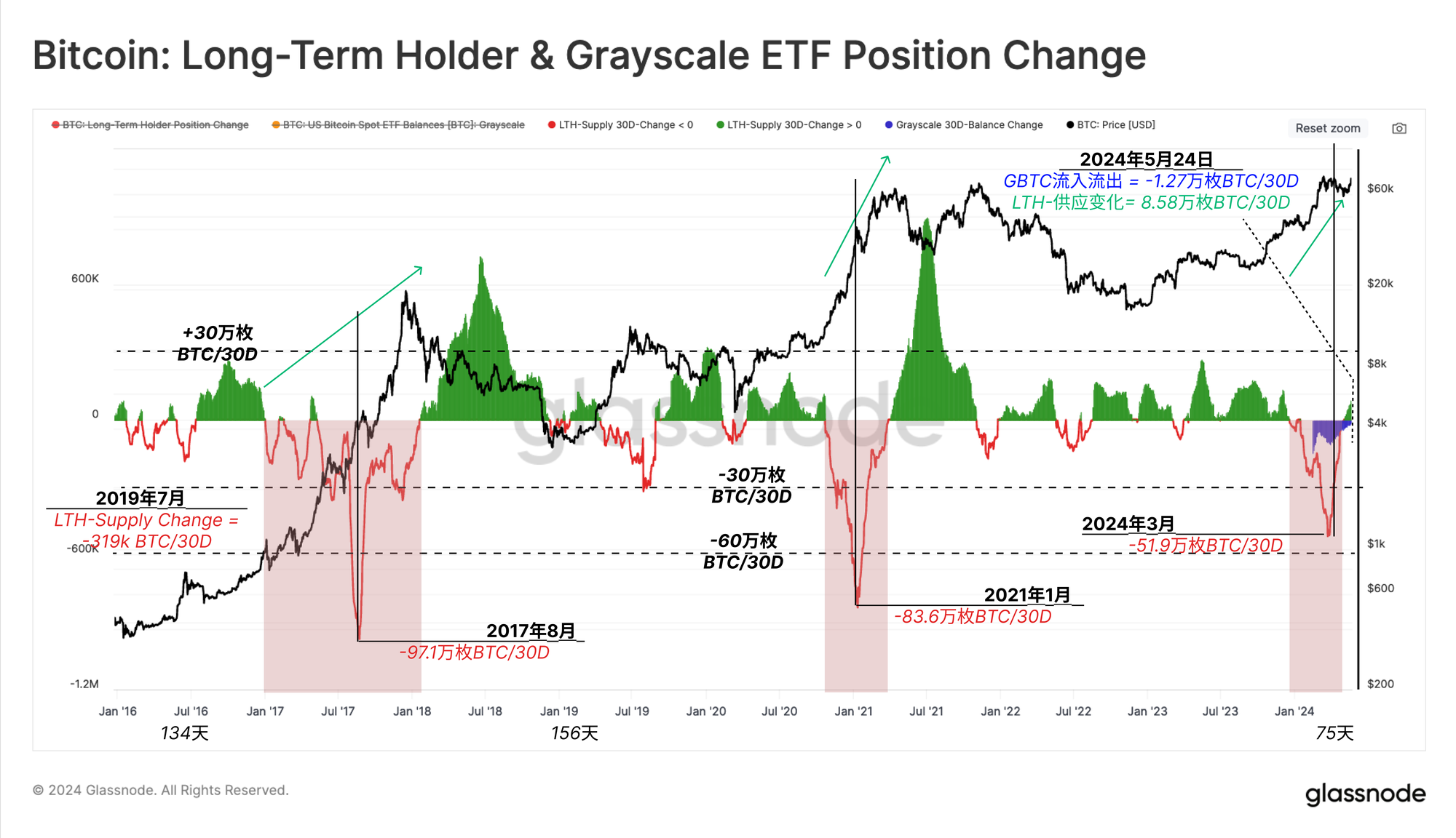 在过去的两次牛市中,长期持有者的净卖出率达到了每月83.6万到97.1万枚比特币。目前,净卖压在3月下旬达到每月51.9万比特币的峰值,其中约20%来自灰度ETF持有者。