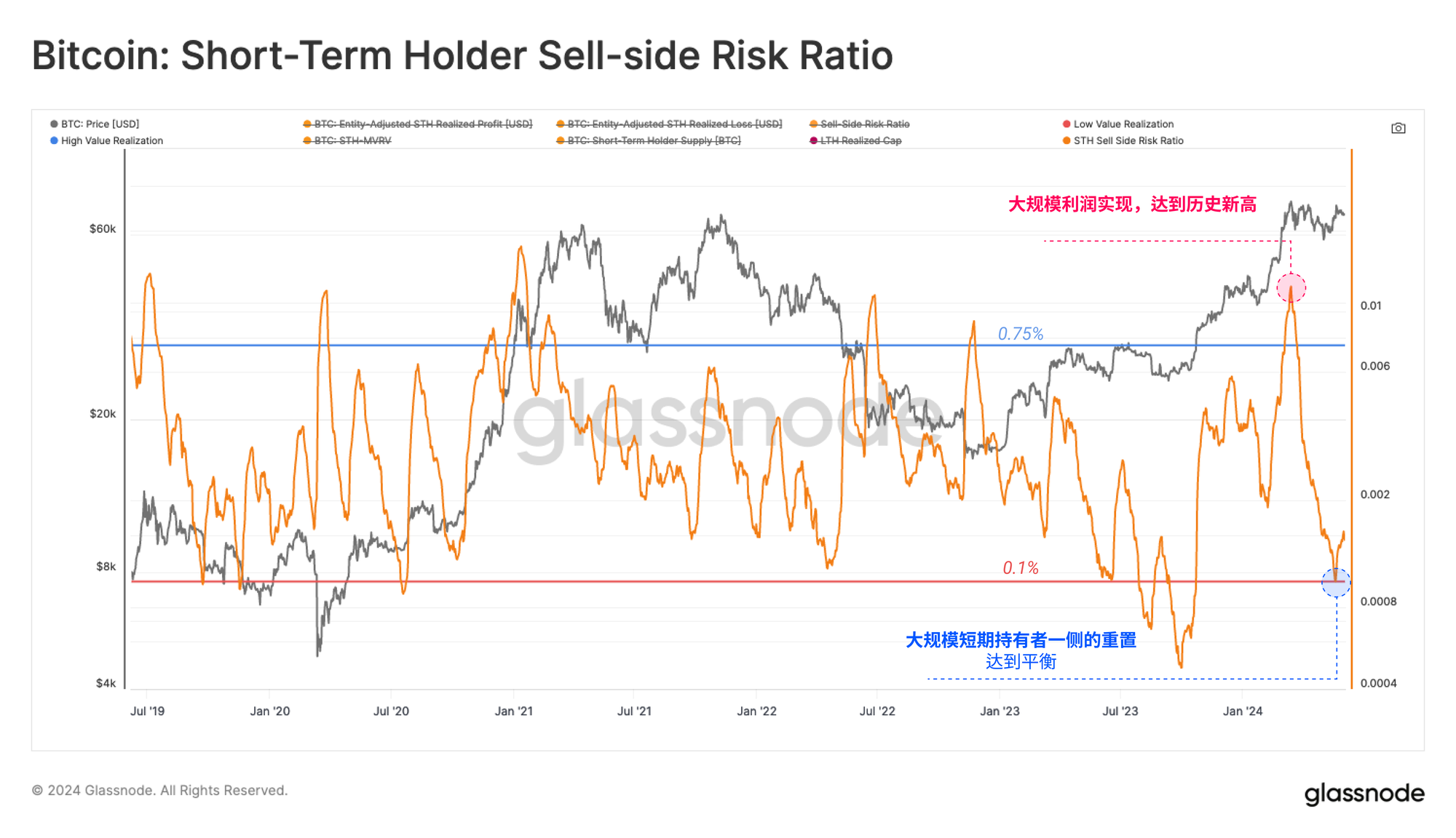 我们可以通过分析长期和短期持有者的卖出行为来研究他们的活动。为此,我们可以利用卖方风险比率,该比率评估投资者锁定的利润加亏损的绝对值,相对于资产规模(以已实现市值衡量)。我们在以下框架下考虑这一指标: