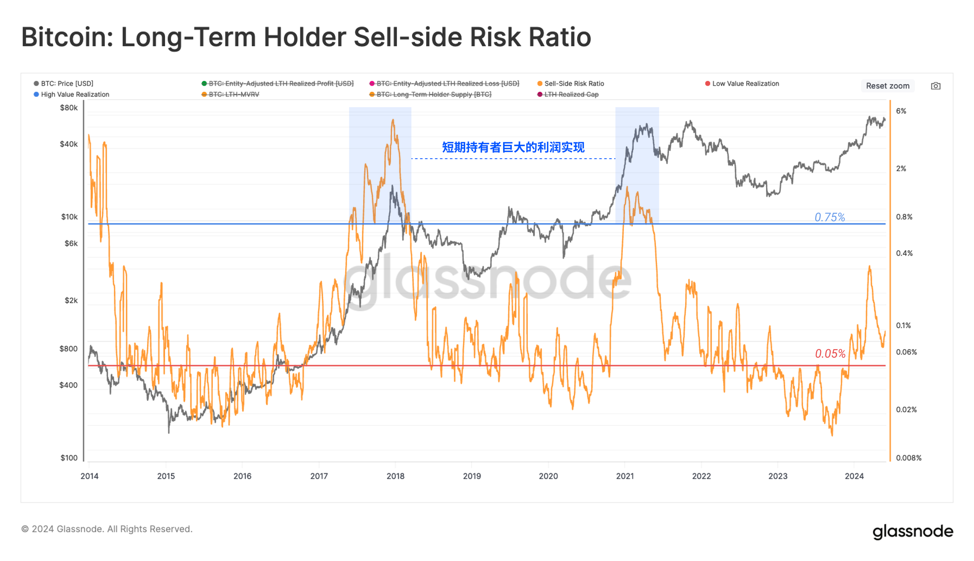对于长期持有者(LTH)群体来说,随着利润在达到73,000美元的历史高点前后被实现,他们的卖方风险比率显著增加。