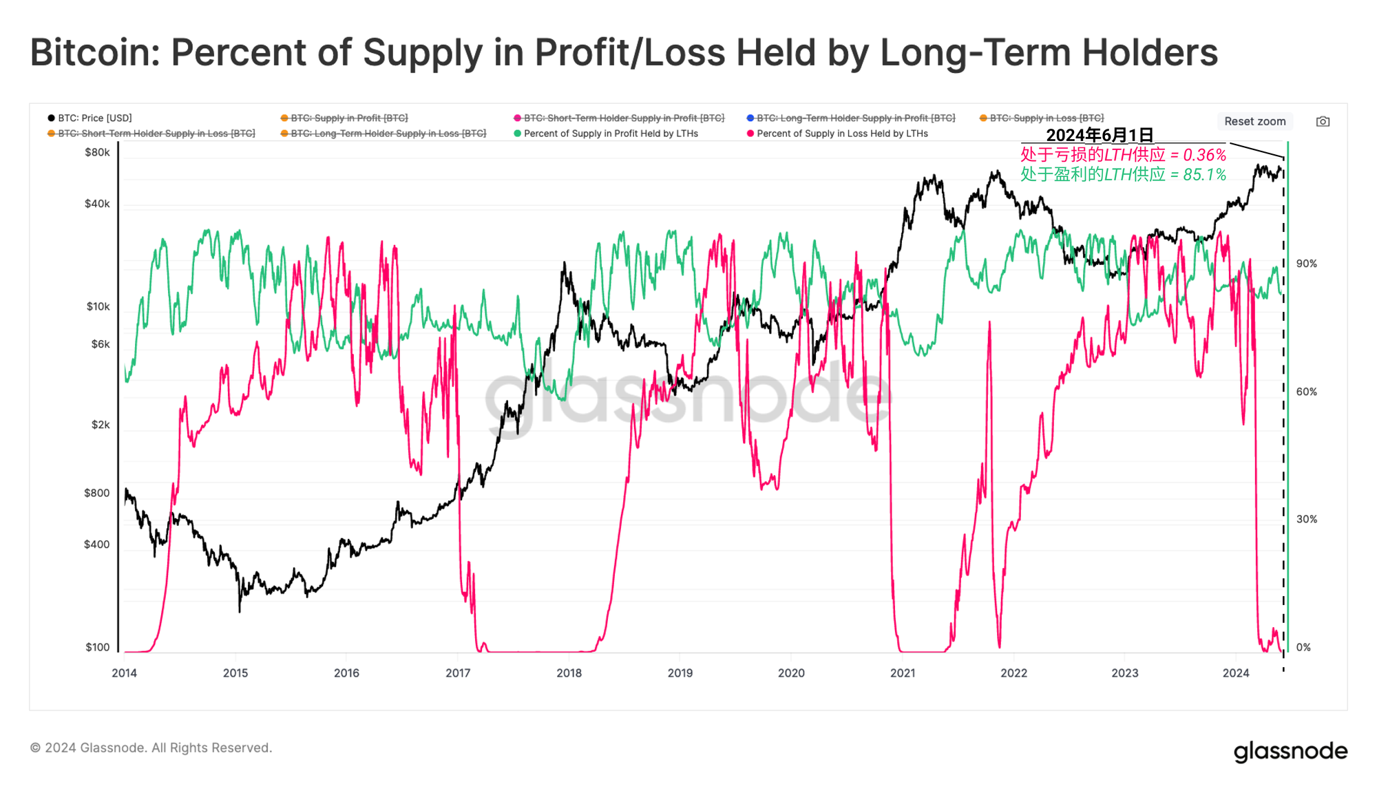 目前,长期持有者仅持有0.3%的亏损供应,同时占有超过85%的盈利供应。