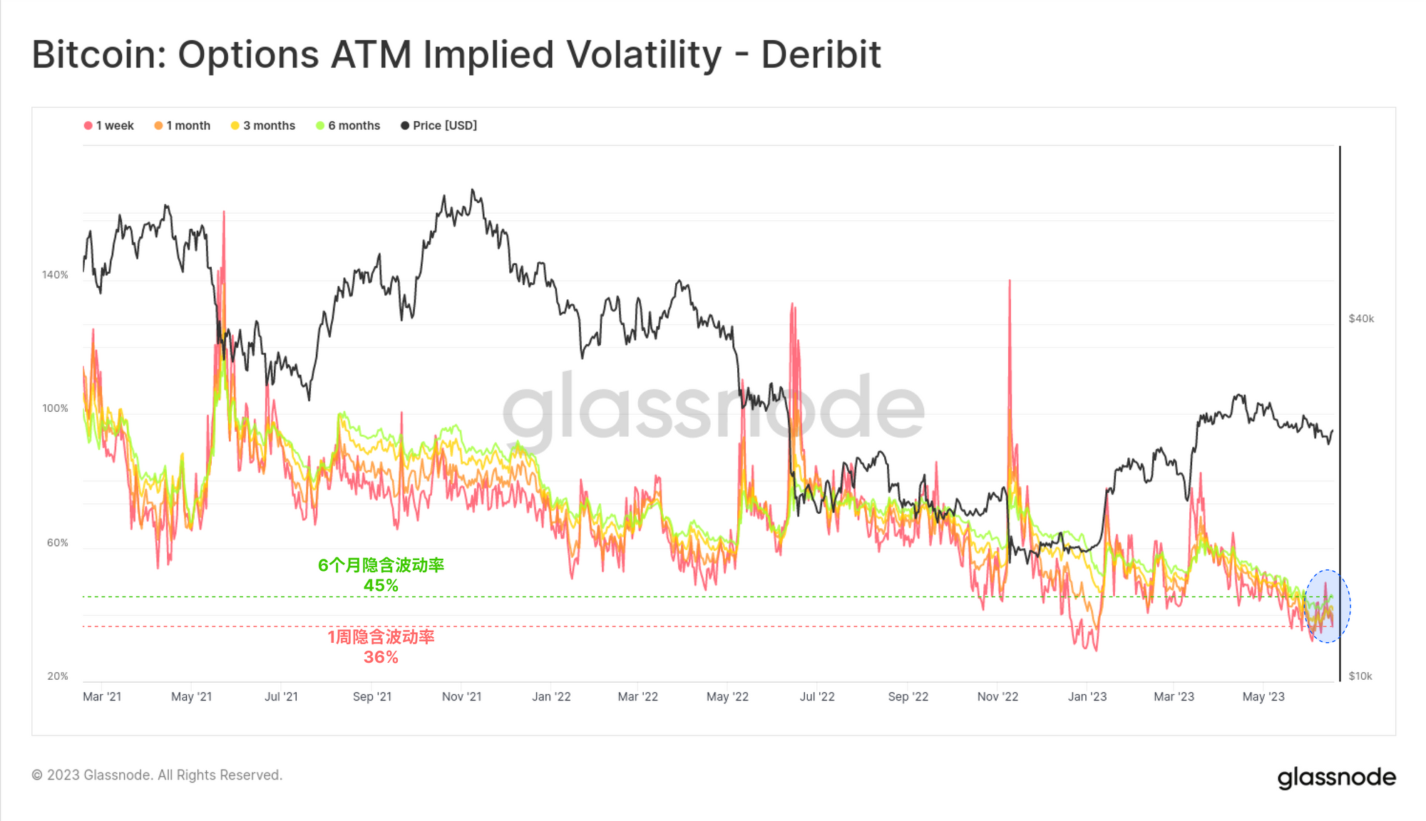 在从一周到六个月的期权合约中,隐含波动率也触及了周期性的低谷。一周短期的隐含波动率已经降至历史第二低的36%,而三个月和六个月的合约的隐含波动率则分别跌至历史最低的42%和46%。