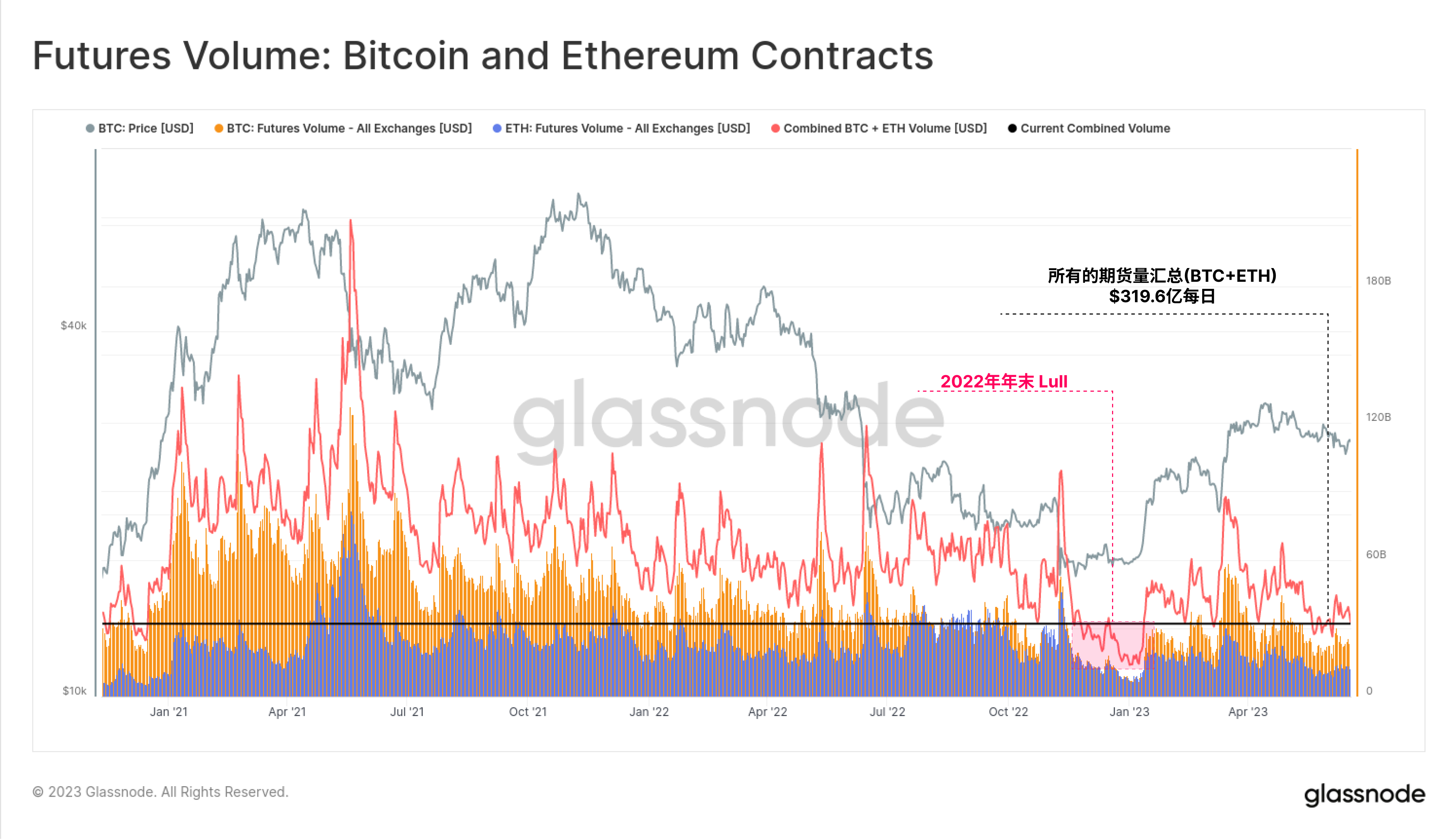 我们在以太坊期货市场中也观察到了这一现象,这表明整个行业的流动性都在收缩。过去30个月里,唯一一个交易量低于现在的时期,就是在2022年年底的冷却阶段。