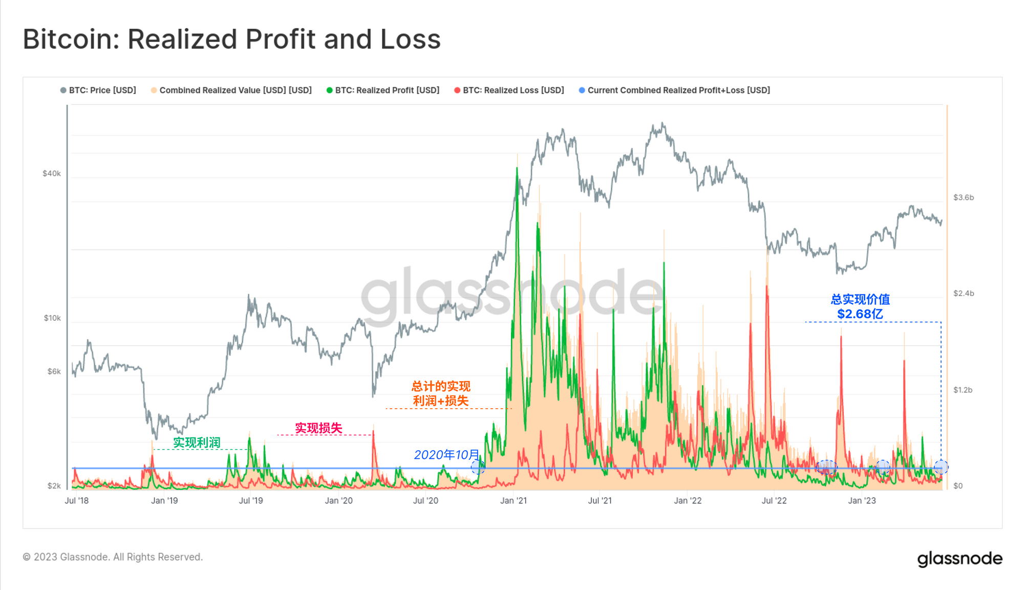 在区块链上,我们也观察到了相似的情况。可以看到,事件中的收益和损失绝对值已降至周期性低点,为2.68亿美元。这已回到了2020年10月的水平(当时BTC价格约为10,000美元),这突出了今年至今在资本流入流出这类资产时,市场的安静程度。