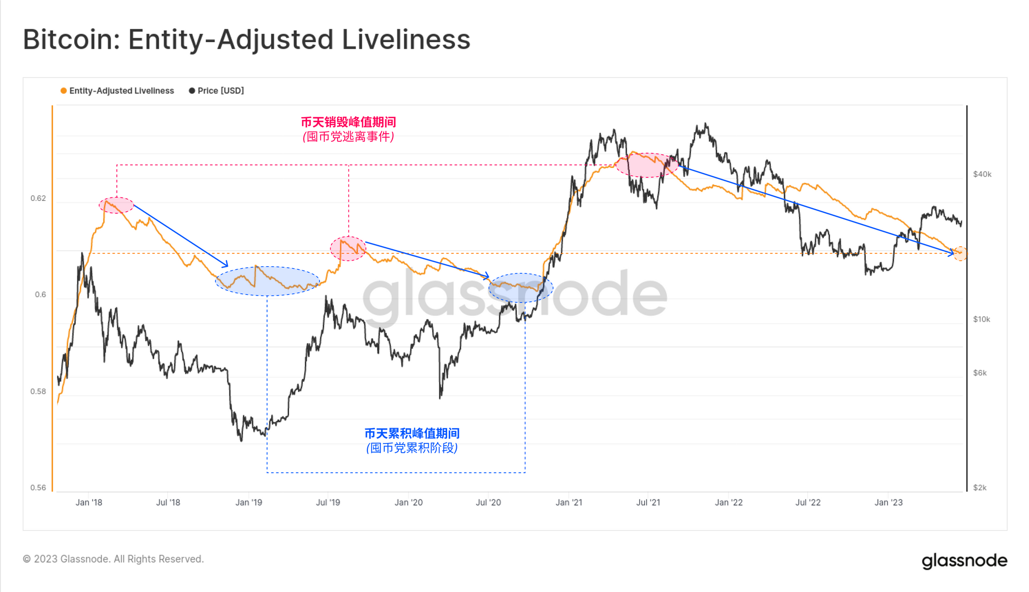 活跃度这个指标给我们提供了一个全局视角,可以了解比特币持有者倾向于卖出还是持有他们的币。目前,活跃度正处于多年的宏观下降趋势中,自2021年5月的熊市首次出现以来,它就达到了顶峰。我们可以看到与2018-20周期相似的结构正在形成,比特币逐渐被转移到冷存储,并被"囤币党"从市场中吸纳。