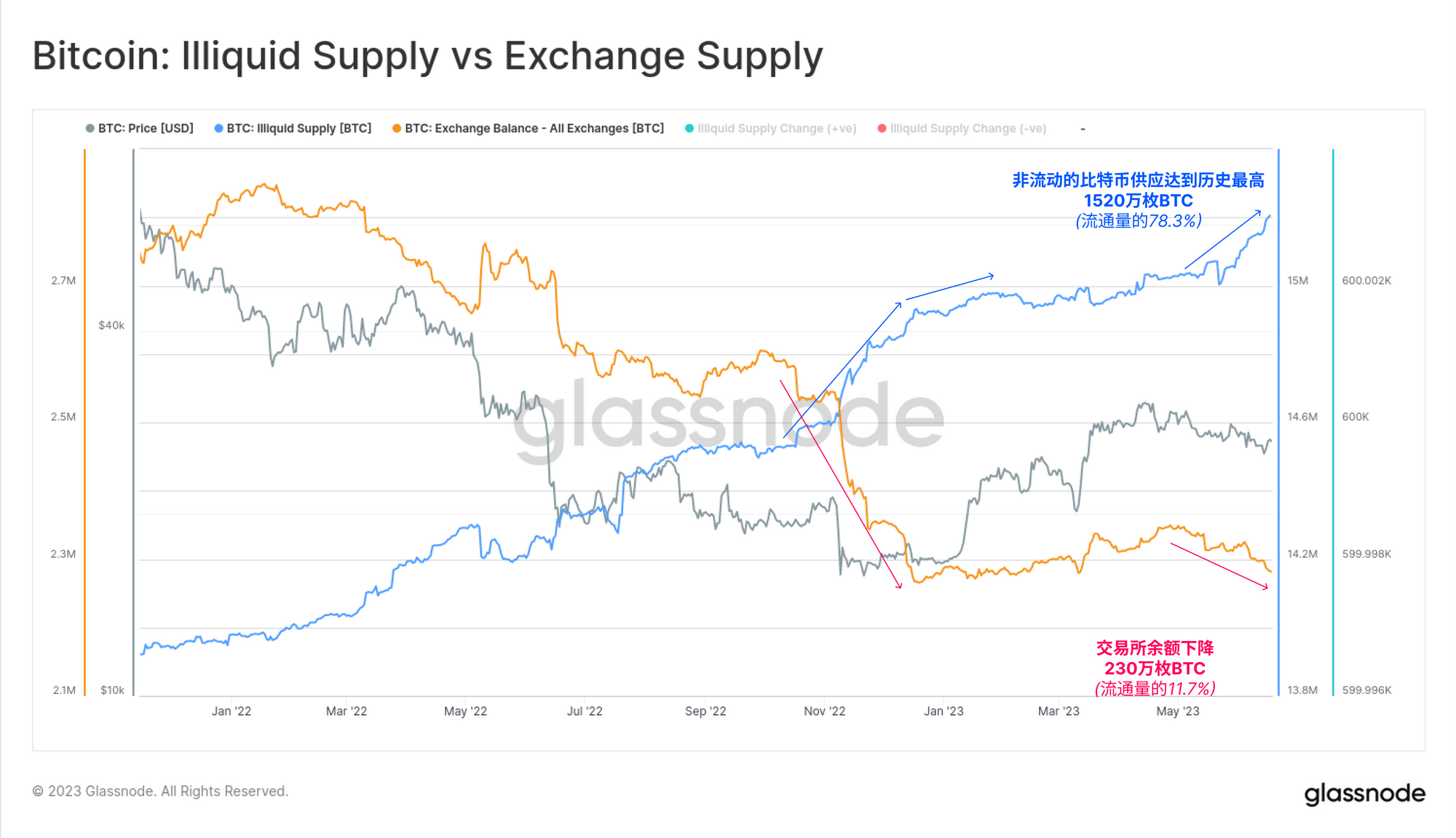 这个观察结果得到了交易所余额和非流动钱包持有的币量之间的差距的进一步支持,非流动钱包是那些几乎没有或没有卖出历史的钱包。本周,非流动供应量达到了新的历史最高点,达到1520万枚BTC,而交易所的余额已经下降到自2018年1月以来的最低水平,为230万枚BTC。